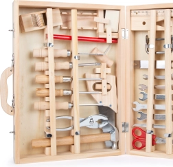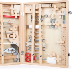 Στη βαλίτσα θα βρείτε ό,τι χρειάζεται για μικρά οικιακά έργα και παιχνίδια ρόλων ως τεχνίτες: κλειδιά, κατσαβίδια, πριόνι, ψαλίδι, σμίλη, μαραγκομολύβι, εξάγωνο κλειδί, σφυρί και άλλα αξεσουάρ. Το σετ 48 τεμαχίων ενισχύει τη λεπτή κινητικότητα, τη συγκέντρωση και τη δημιουργικότητα.