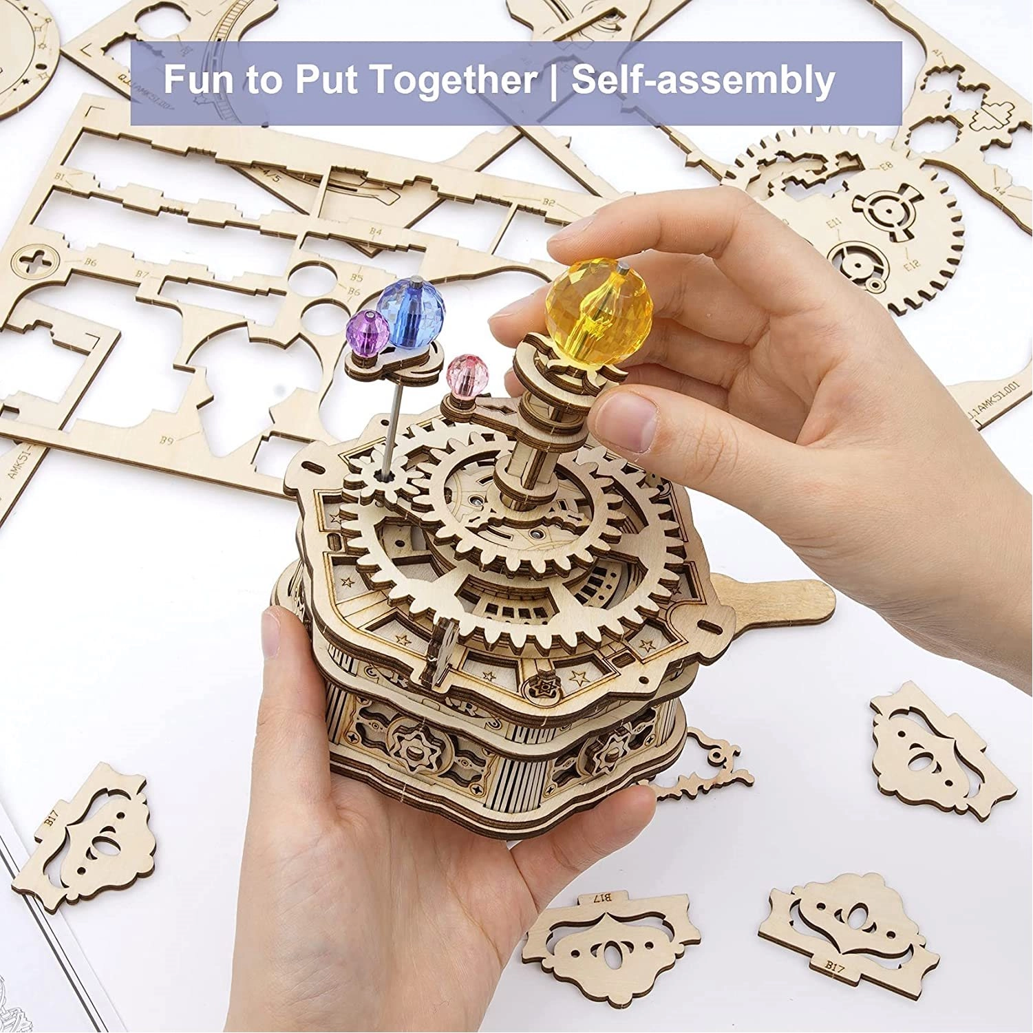 Η Έναστρη νύχτα αποτελεί φόρο τιμής στα ιστορικά μοντέλα orrery. Με το κούρδισμα, χάρη στο έξυπνο σύστημα γραναζιών και τον μεσημβρινό δακτύλιο, οι πλανήτες περιστρέφονται κομψά δημιουργώντας ομαλή, χαλαρωτική κίνηση. Τα επιμέρους κομμάτια από κόντρα πλακέ φλαμουριάς 2 mm είναι ακριβώς κομμένα με λέιζερ και αποσπώνται εύκολα απευθείας από τα φύλλα.