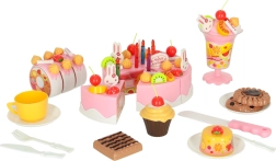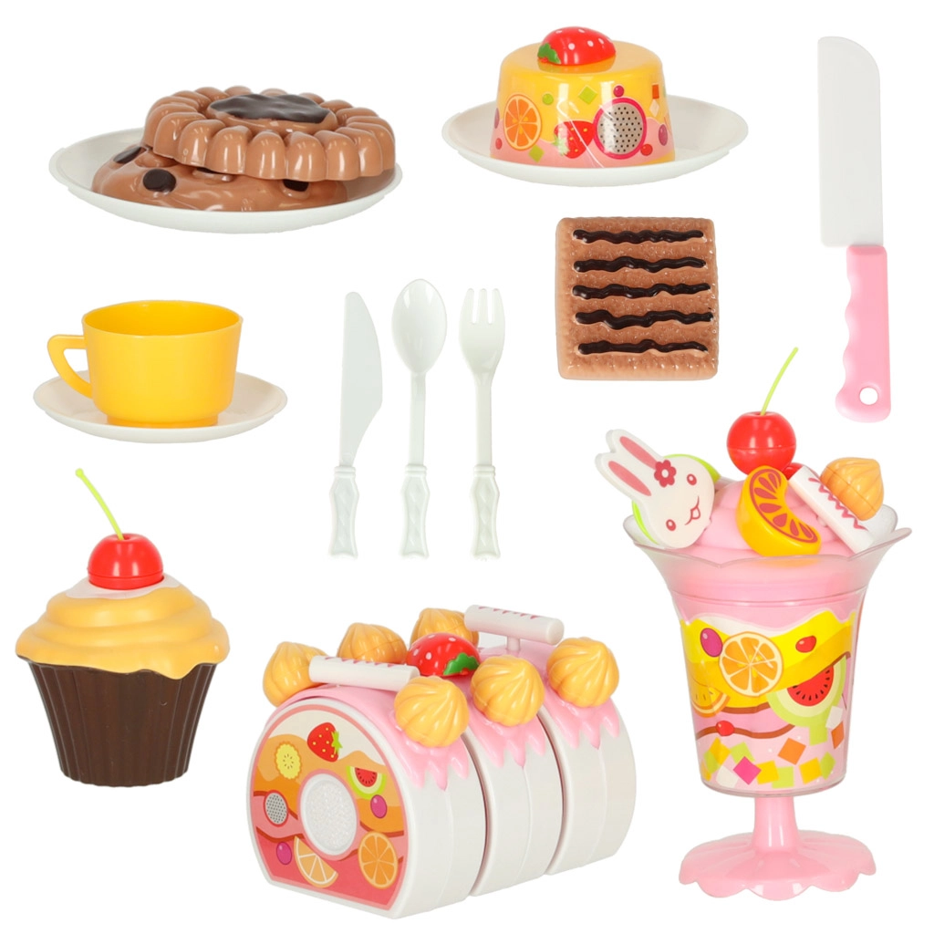 Εκτός από την τούρτα, περιλαμβάνει μπισκότα, ρολάκια, cupcake, ποτήρι παγωτού και εργαλεία – όλα για ρεαλιστικό παιχνίδι πάρτι.
