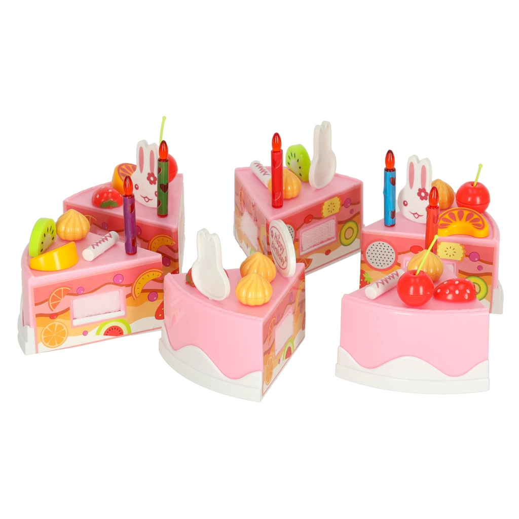 - 6 κομμάτια τούρτας, 5× κεράκι, 14× μαρεγκάκια, 7× ζαχαρωτά μπαστουνάκια, 4× κερασάκι, 4× μανταρίνι, 3× φράουλα, 3× ακτινίδιο, 4× κουνελάκι, πινακίδα “Happy Birthday”, 3× πιατάκι, 3× μπισκότο, 3× κομμάτι ρολό, κουπάκι, κουταλάκι, πιρουνάκι, μαχαιράκι, σπάτουλα τούρτας, ποτήρι παγωτού, αυτοκόλλητα, σετ βέλκρο