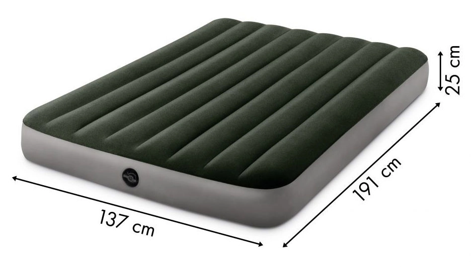 Το φουσκωτό στρώμα Intex με διαστάσεις 191x137x25 cm είναι ιδανικό για δύο άτομα. Είναι κατασκευασμένο από ανθεκτικό υλικό PVC, ενώ το επάνω μέρος του είναι καλυμμένο με αδιάβροχο βελούδινο ύφασμα ευχάριστο στην αφή.