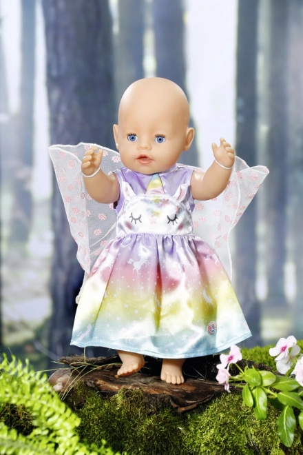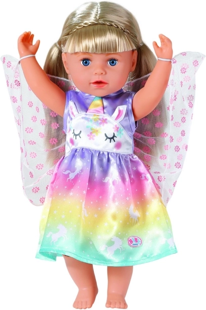 Μετατρέψτε κάθε παιχνίδι σε παραμυθένια περιπέτεια. Αυτό το φόρεμα για την κούκλα BABY born μεγέθους 43 cm (κατάλληλο και για 39–46 cm) λάμπει με ιριδίζουσα μετάβαση χρωμάτων, μοτίβα μονόκερου και απαλά φτερά. Χάρη στα ποιοτικά υλικά αντέχει πολλά ντυσίματα, τσάγια-πάρτι και βασιλικές παρελάσεις.