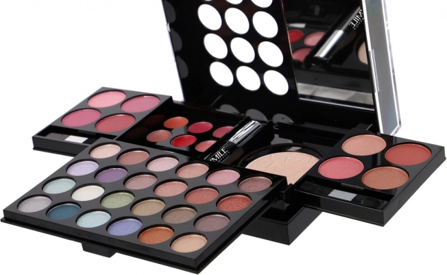 - 24× σκιές ματιών, 8× ρουζ, 6× κρεμώδες gloss χειλιών, 1× πούδρα, 1× μάσκαρα, 1× σετ 4 εφαρμογέων/πινέλων, ενσωματωμένο καθρεφτάκι