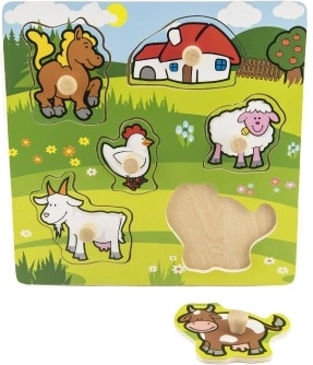 Αυτό το παζλ περιλαμβάνει συνολικά 5 πολύχρωμα ζωάκια, μεταξύ των οποίων αλογάκι, κατσίκα, προβατάκι, κοτούλα και αγελάδα, τα οποία είναι εύκολα στο πιάσιμο χάρη στις μικρές ξύλινες λαβές. Κάθε κομμάτι έχει τη δική του θέση στη ξύλινη βάση, γεγονός που βοηθά τα παιδιά να μάθουν τη σωστή τοποθέτηση κάθε κομματιού.