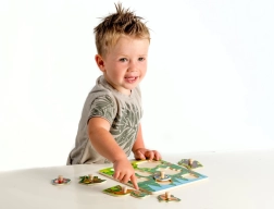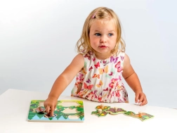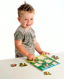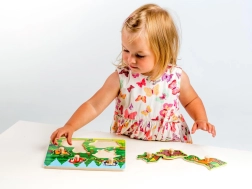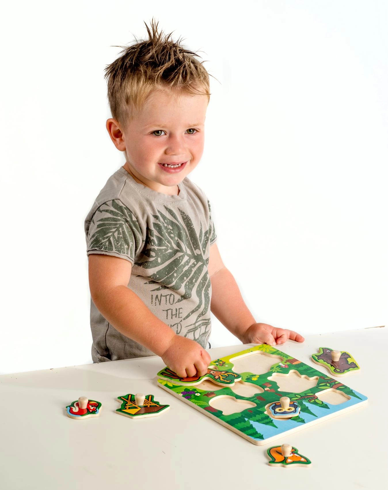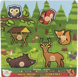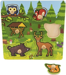 Τα δασικά θέματα, όπως κουκουβάγια, σκιουράκι, αγριόχοιρος και ελάφι, παρακινούν για ανακάλυψη με διασκεδαστικό τρόπο. Η ξύλινη βάση με πλαίσια κρατά κάθε κομμάτι στη θέση του και διευκολύνει τη σωστή αντιστοίχιση σύμφωνα με το σχήμα και την εικόνα.