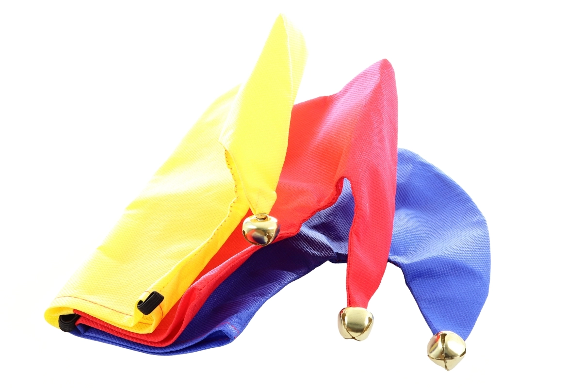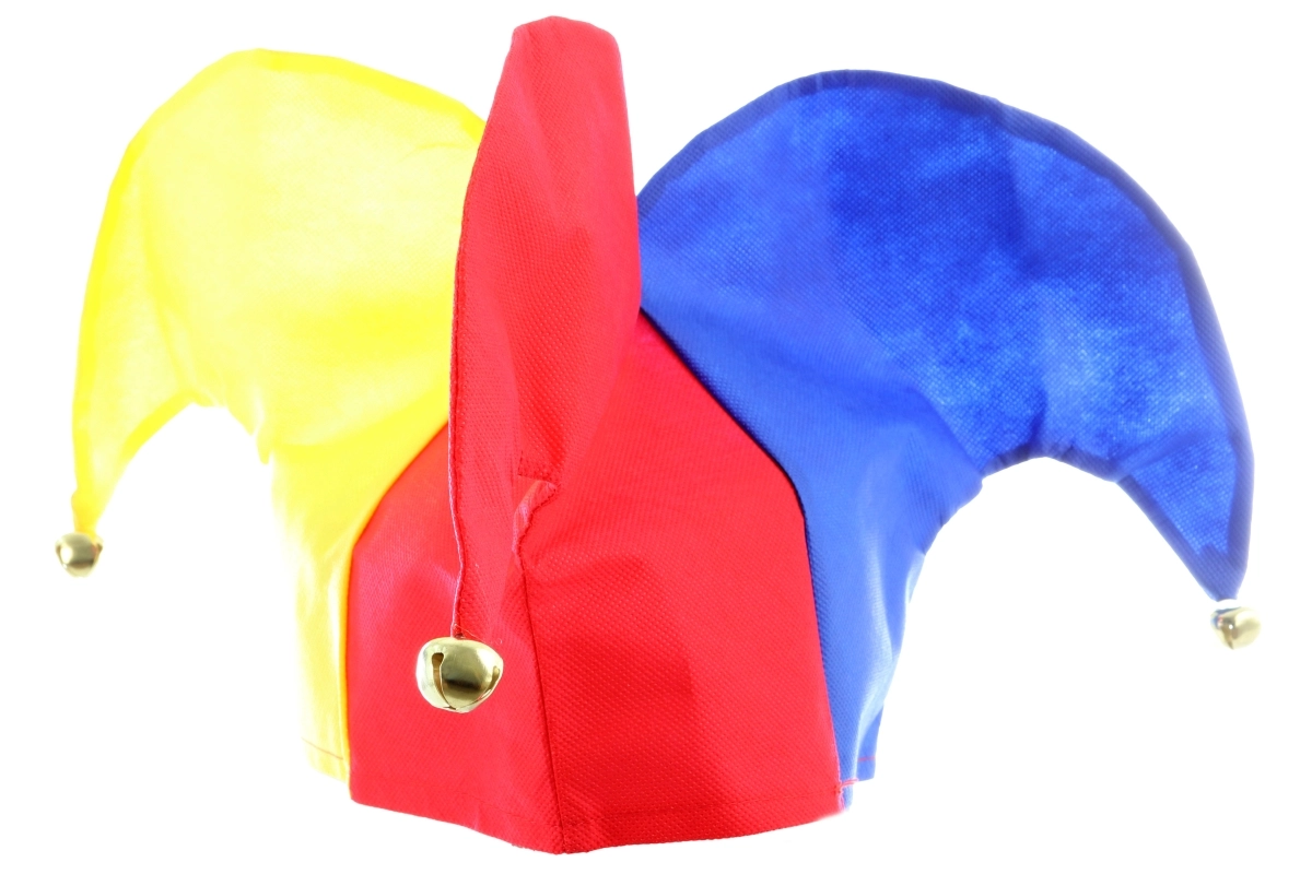 Πολύχρωμο καπέλο κλόουν σε κίτρινο, κόκκινο και μπλε με μεταλλικά κουδουνάκια για παιχνιδιάρικη αίσθηση σε κάθε κίνηση.
