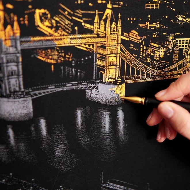 Ανακαλύψτε τη μαγεία της τεχνικής ξυσίματος: κάτω από τη μαύρη στρώση κρύβεται χρυσό υπόβαθρο, που χαρίζει σε κάθε χάραγμα έναν έντονο, κομψό αντίθετο εφέ. Το μοτίβο της εμβληματικής Όπερας του Σίδνεϊ σε νυχτερινή εκδοχή θα ενθουσιάσει αρχάριους και προχωρημένους, ενώ το τελικό έργο θα γίνει μια πρωτότυπη διακόσμηση.