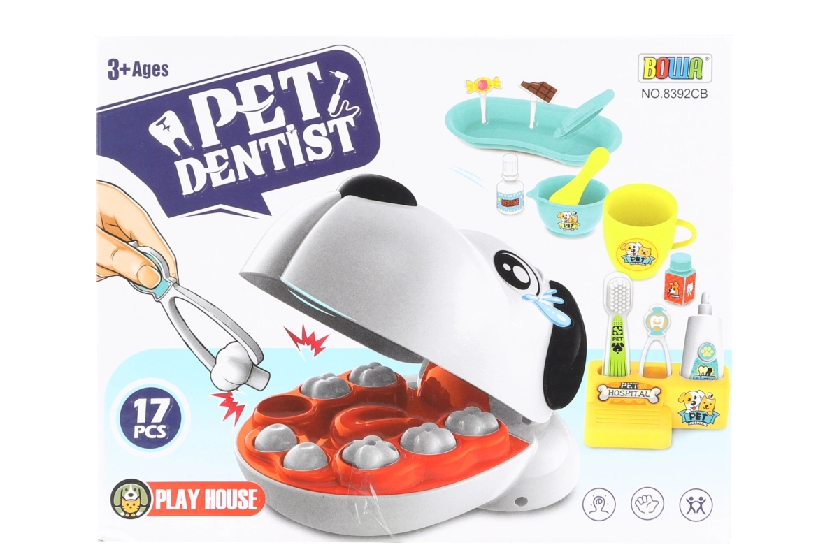 Το χαριτωμένο κεφάλι σκύλου με ανοιχτό στόμα επιτρέπει ασφαλή και παραστατική «θεραπεία» – έλεγχο, τρύπημα και «σφράγισμα». Το καθρεφτάκι με φωτισμό (με μπαταρίες) κάνει το παιχνίδι πιο ευχάριστο και αυξάνει τον ρεαλισμό. Η πλαστική «σοκολάτα» και τα «ζαχαρωτά» χρησιμεύουν ως εξαιρετικό βοήθημα για να εξηγηθεί γιατί είναι σημαντικό να βουρτσίζουμε τα δόντια και να πηγαίνουμε για προληπτικούς ελέγχους.