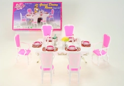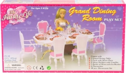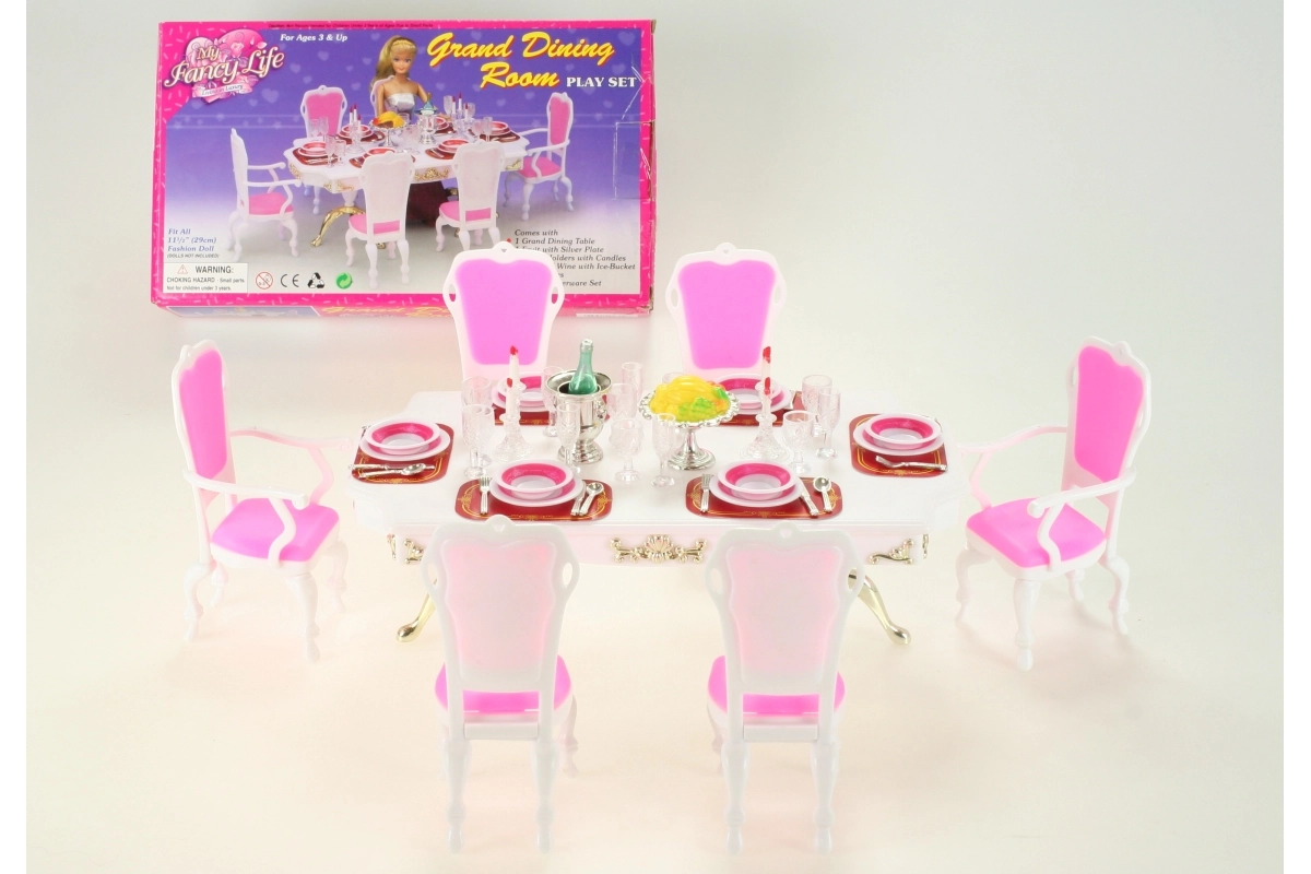 Το στιλάτο σετ Glorie για δείπνο κουκλών μετατρέπει κάθε δωματιάκι σε κομψή τραπεζαρία. Περιλαμβάνει μεγάλο πλαστικό τραπέζι, 6 καρέκλες (2 με μπράτσα) και πλούσιο στρώσιμο τραπεζιού με ποτήρια, πιάτα και μαχαιροπίρουνα. Ιδανικό για δημιουργικό παιχνίδι παιδιών από 3 ετών.