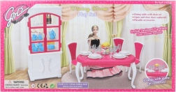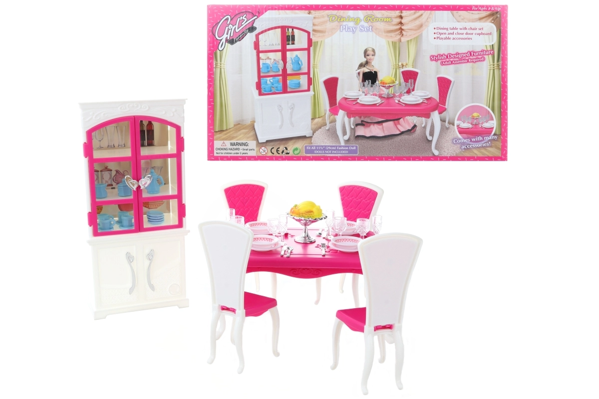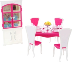 Το σετ τραπεζαρίας Glorie για κούκλες προσφέρει μια ολοκληρωμένη εμπειρία γεύματος με ένα κομψό πλαστικό τραπέζι, τέσσερις καρέκλες και ντουλάπι, συμπληρωμένο με πιάτα, ποτήρια, μαχαιροπίρουνα και διακοσμητικά αξεσουάρ.