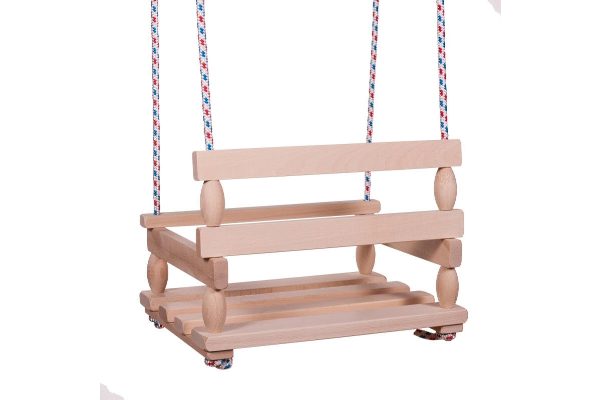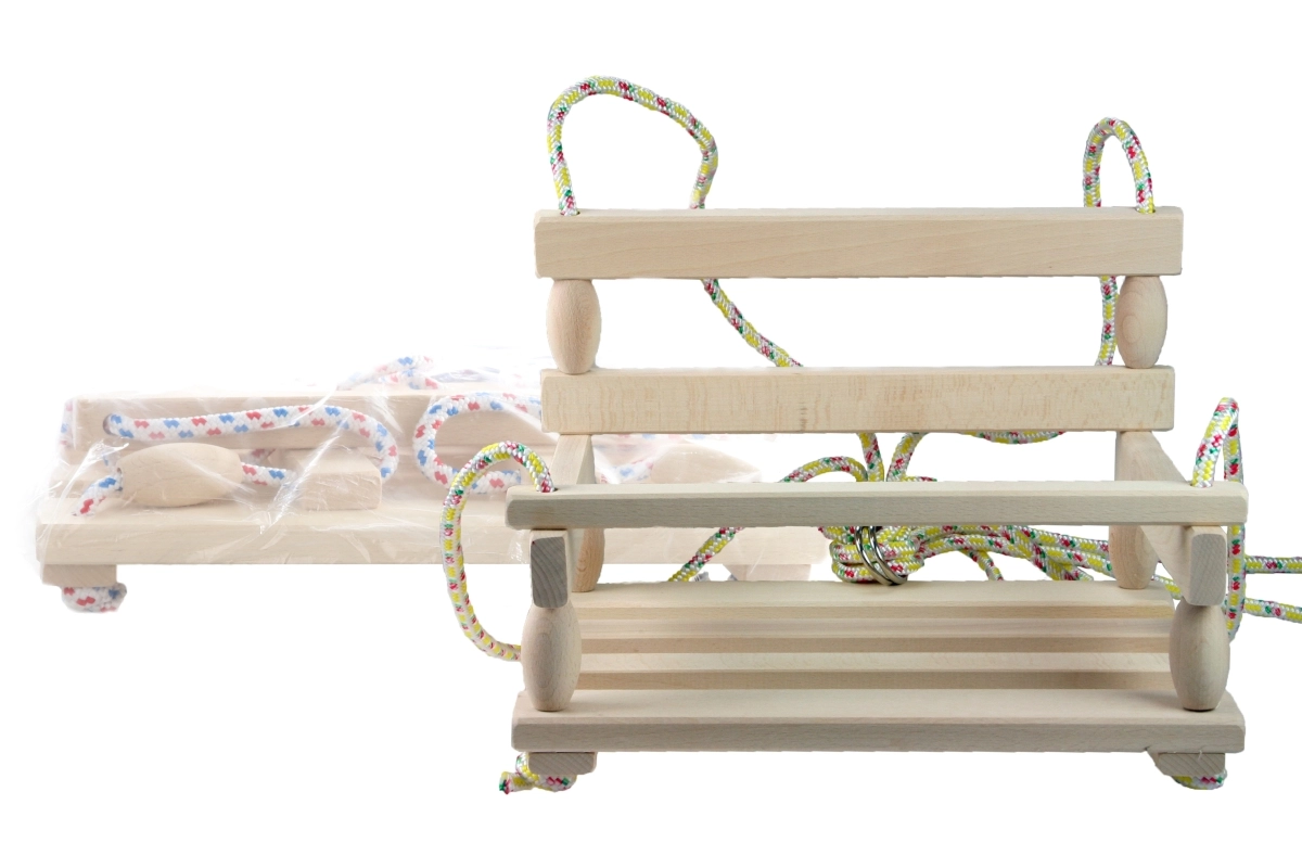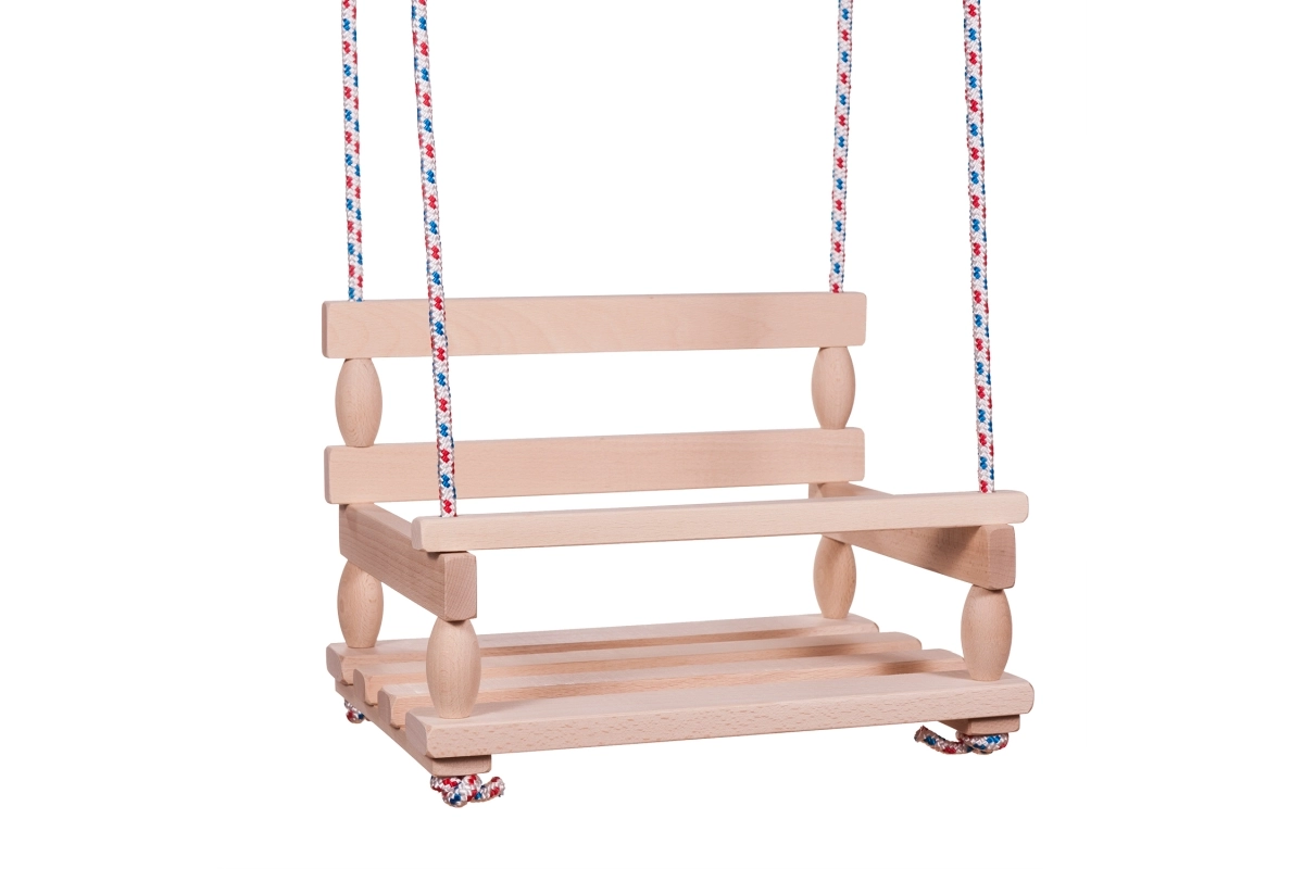 Καθολική ξύλινη κούνια από φυσικό ξύλο με φαρδιά έδρα 40 × 30 cm και μέγιστο φορτίο έως 80 kg. Ιδανική για κήπο και βεράντα, με σταθερή και ανθεκτική κατασκευή, εύκολη συναρμολόγηση και τσέχικη κατασκευή σε πρακτική σακούλα.