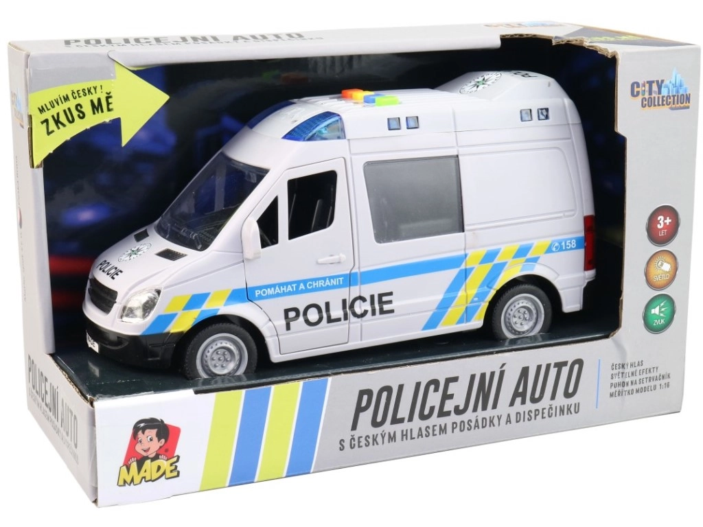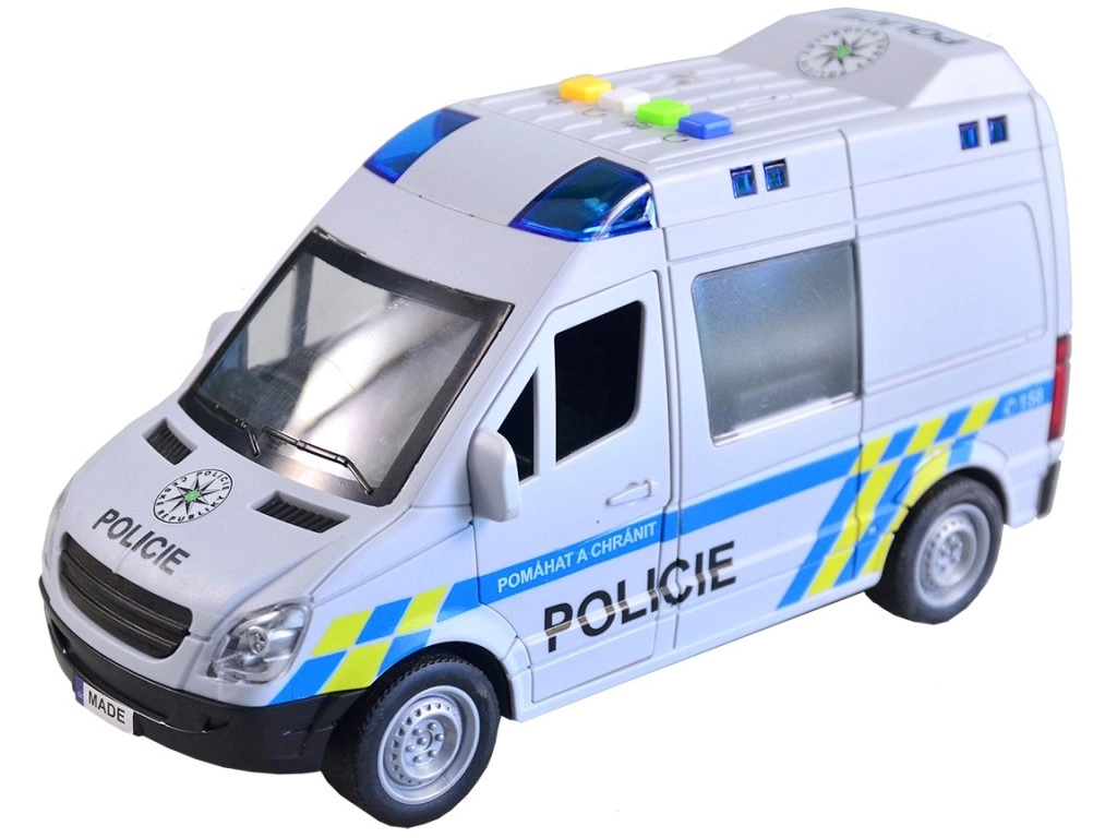 Ρεαλιστικό αστυνομικό βαν για μικρούς διασώστες με ελληνικές φωνητικές ανακοινώσεις πληρώματος και κέντρου επιχειρήσεων, λειτουργικό μπλε φάρο και μηχανισμό αδράνειας. Ανοιγόμενες πόρτες και λεπτομερής κατασκευή σε κλίμακα 1:16 εξασφαλίζουν άφθονη διασκέδαση. Το μήκος του οχήματος είναι 21 εκ., τροφοδοσία 3× 1,5 V AG13. Κατάλληλο από 3 ετών.
