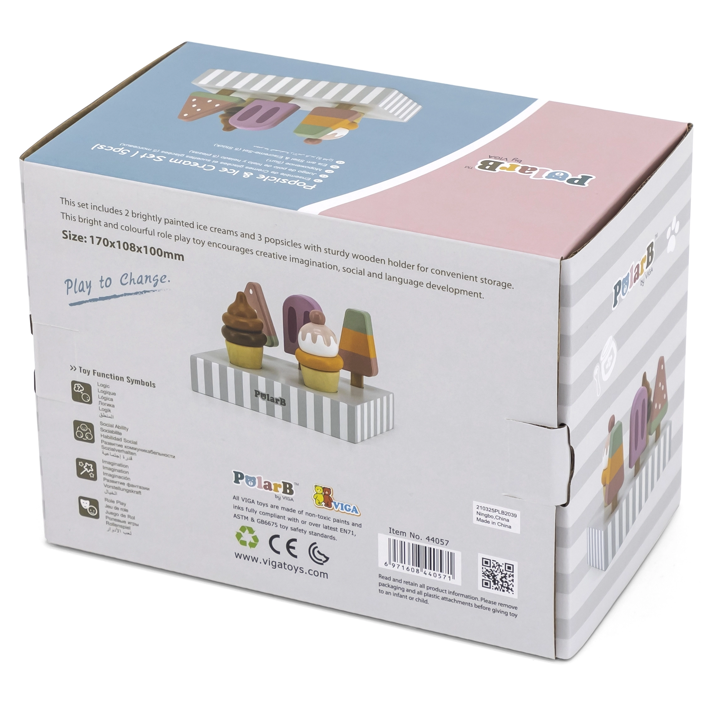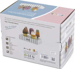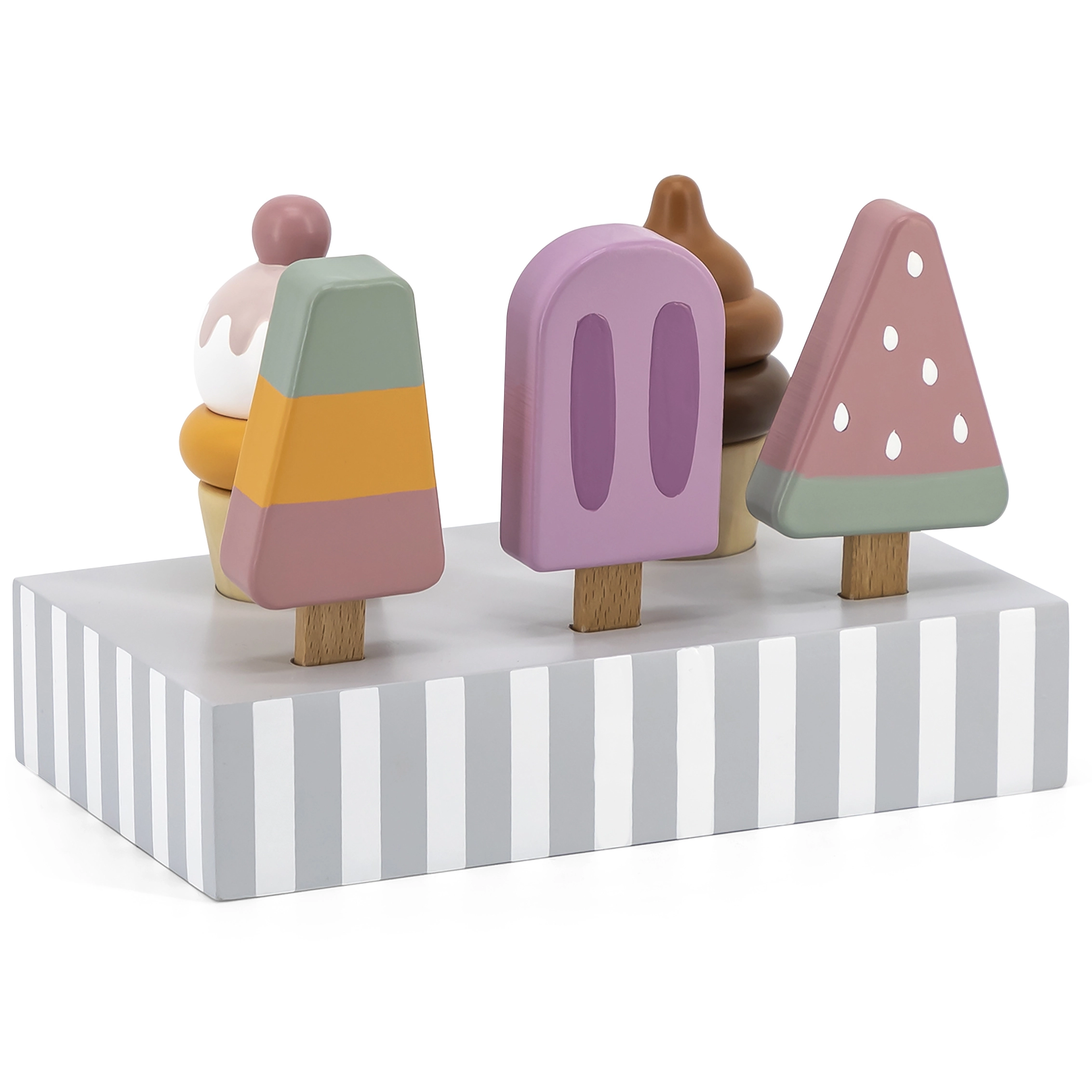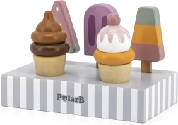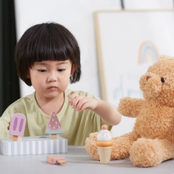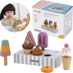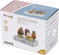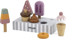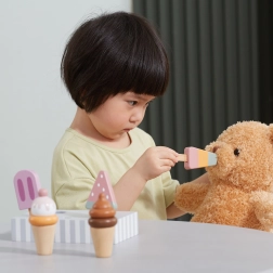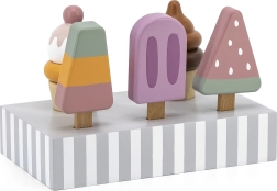 Το σετ με 5 ξύλινα παγωτά σε δελεαστικά χρώματα προσφέρει στα παιδιά ατελείωτη διασκέδαση. Τα παγωτά τοποθετούνται σε σταθερή ξύλινη βάση, που χρησιμεύει για έκθεση και οργανωμένη αποθήκευση. Όλα είναι φτιαγμένα από ποιοτικό ξύλο και βαμμένα με ασφαλή, μη τοξικά χρώματα.