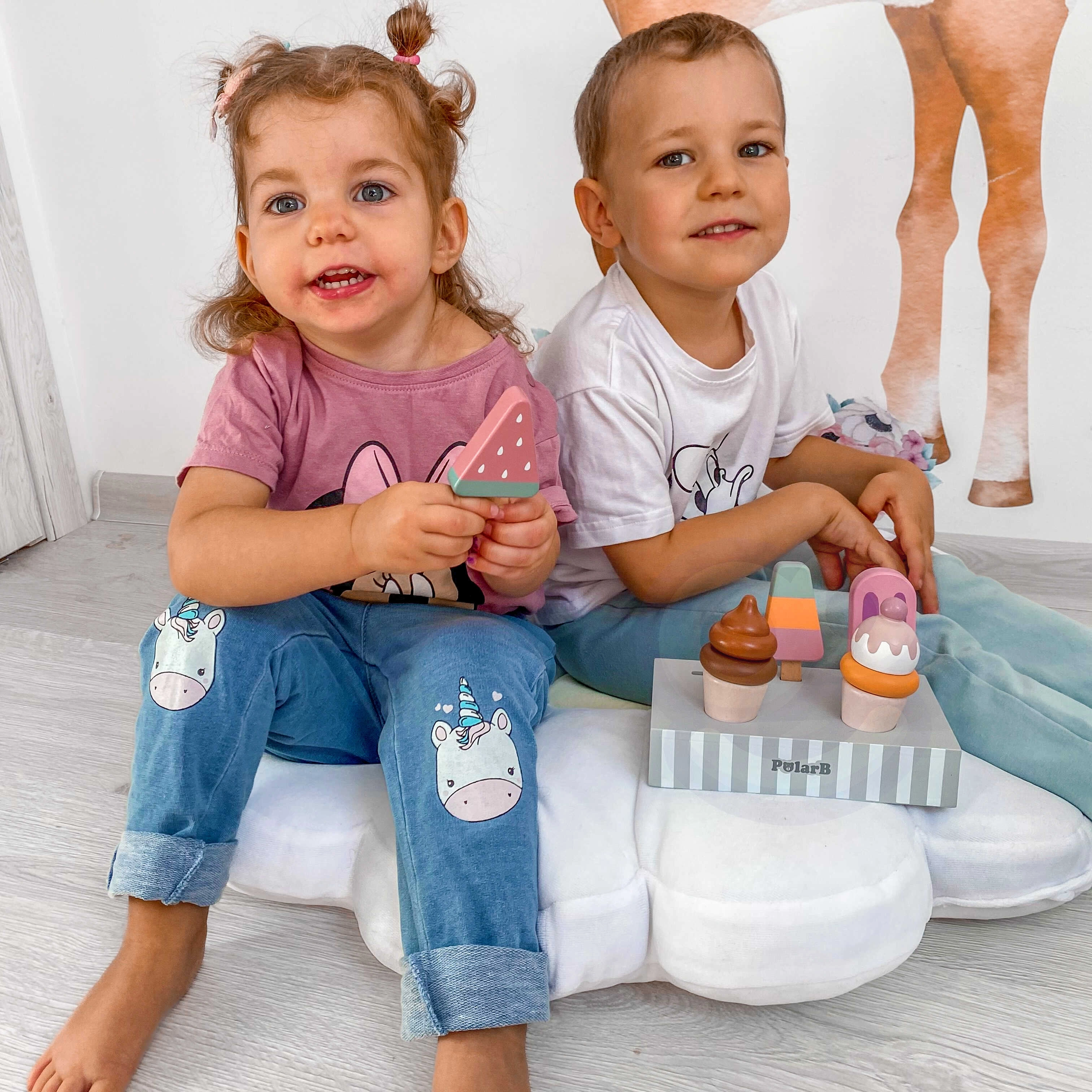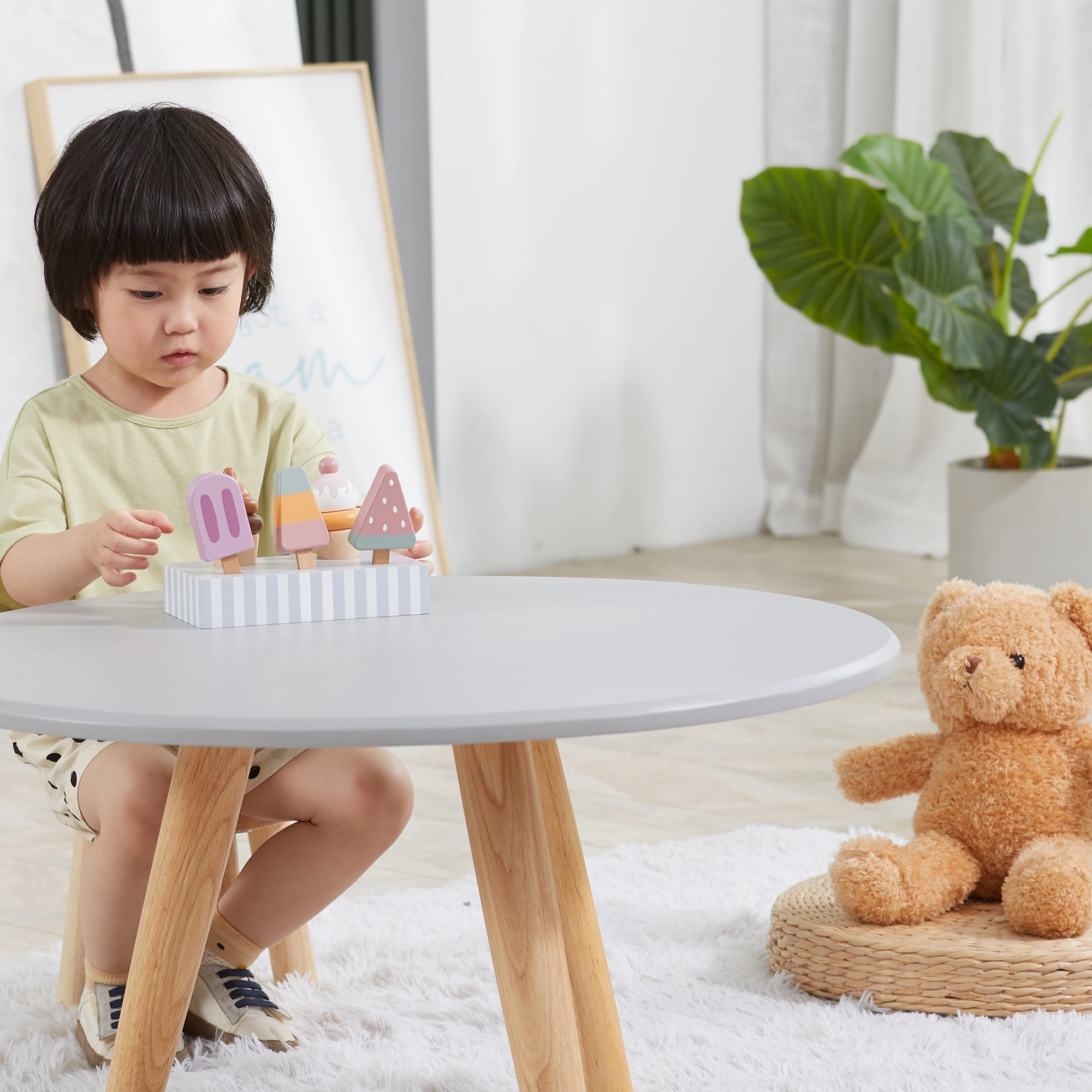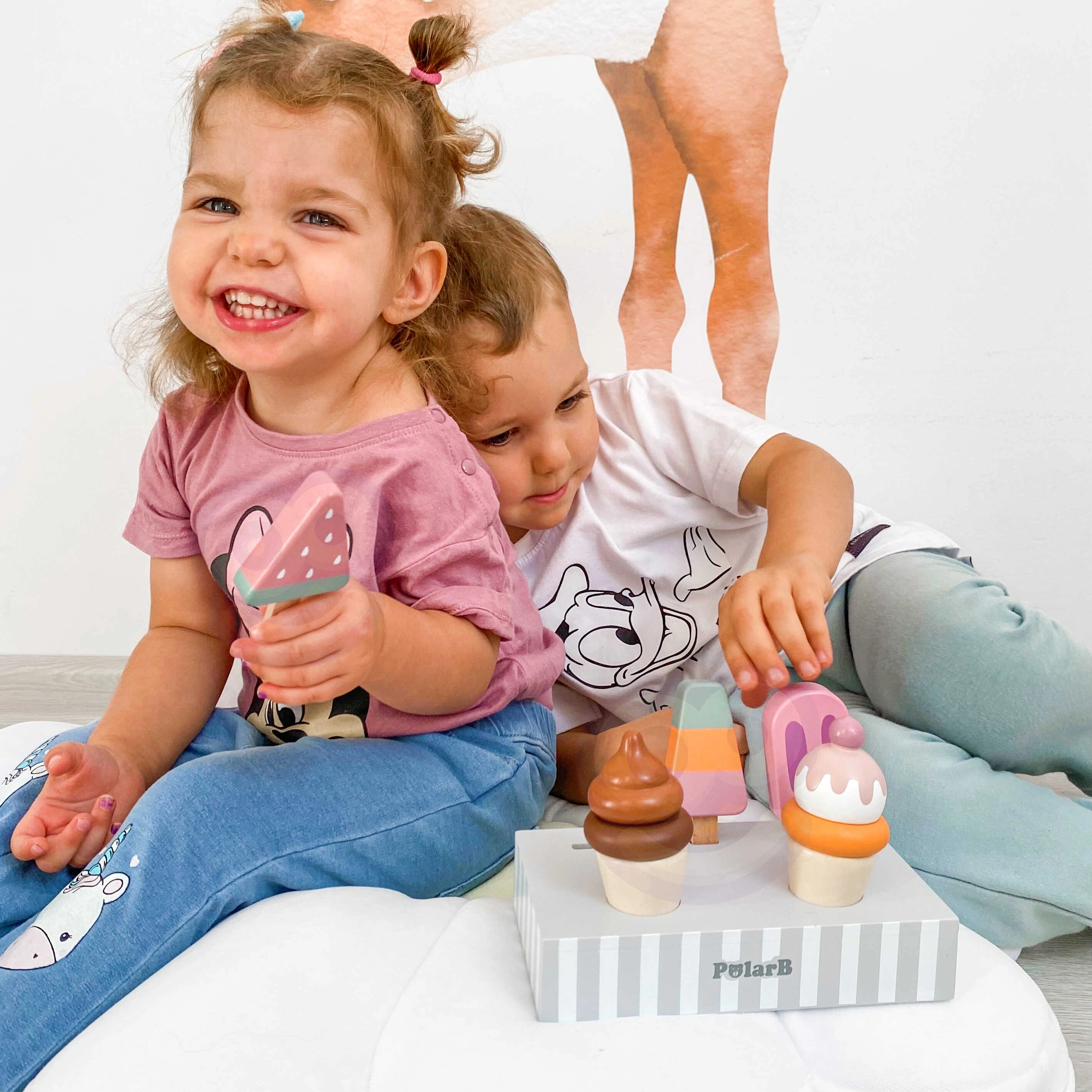 Το σετ με 5 ξύλινα παγωτά σε δελεαστικά χρώματα προσφέρει στα παιδιά ατελείωτη διασκέδαση. Τα παγωτά τοποθετούνται σε σταθερή ξύλινη βάση, που χρησιμεύει για έκθεση και οργανωμένη αποθήκευση. Όλα είναι φτιαγμένα από ποιοτικό ξύλο και βαμμένα με ασφαλή, μη τοξικά χρώματα.