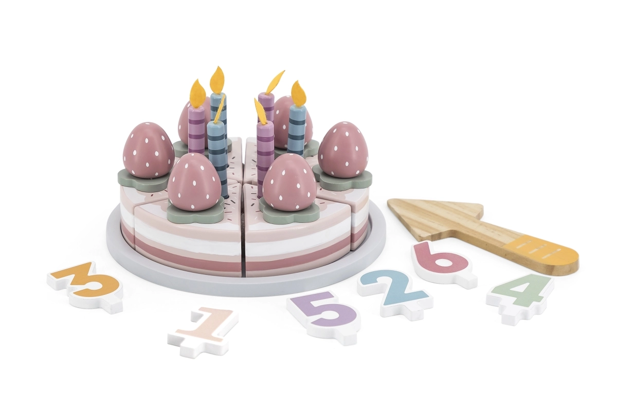 - Πλήρες σετ: 6 κομμάτια τούρτας, κεράκια, φραουλίτσες, κυβάκια αριθμών, πιάτο και σπάτουλα.