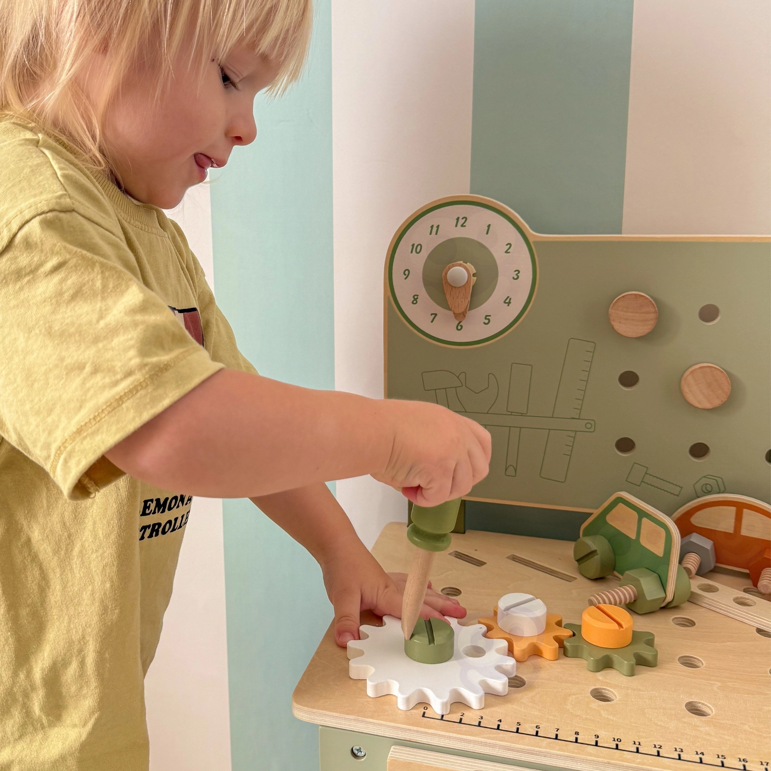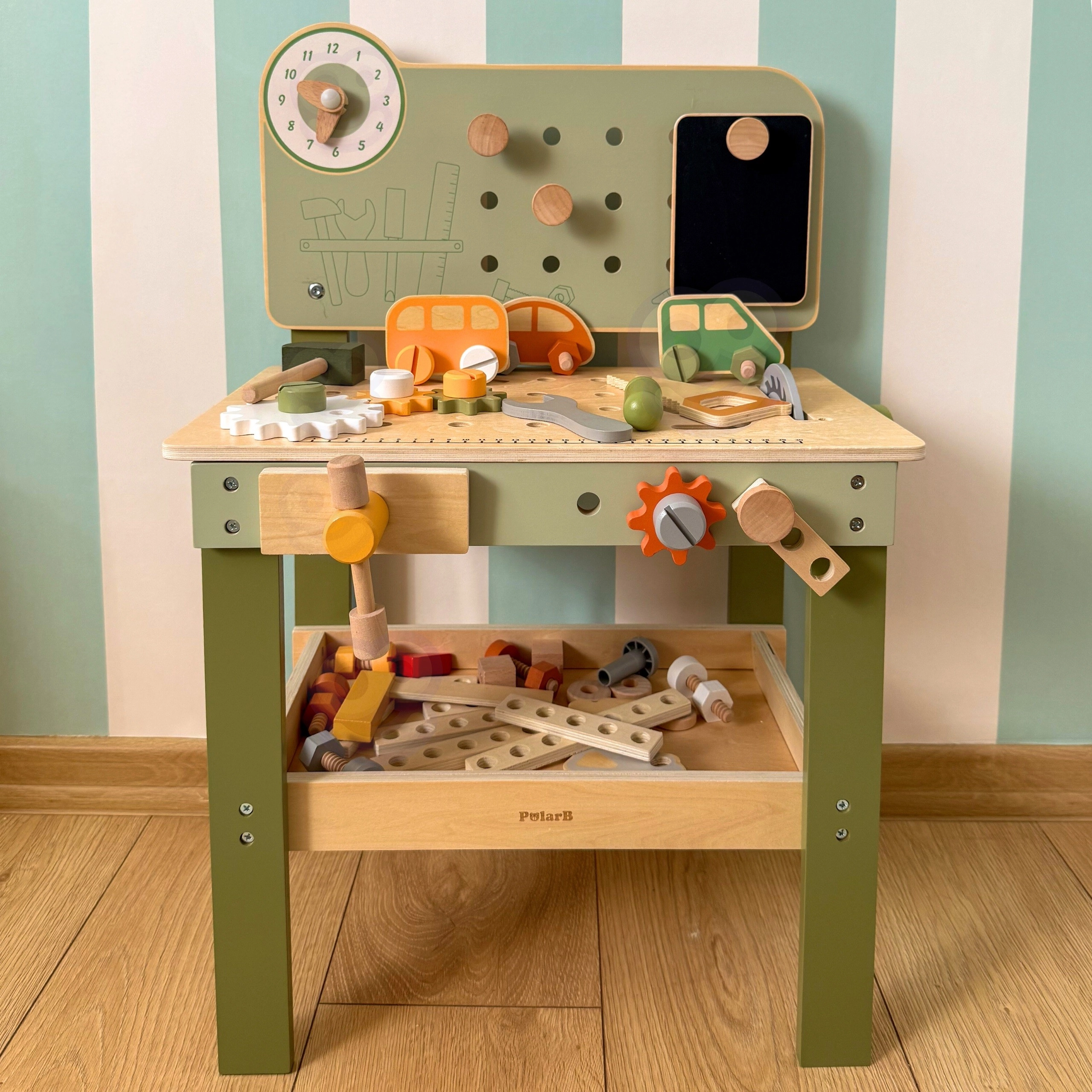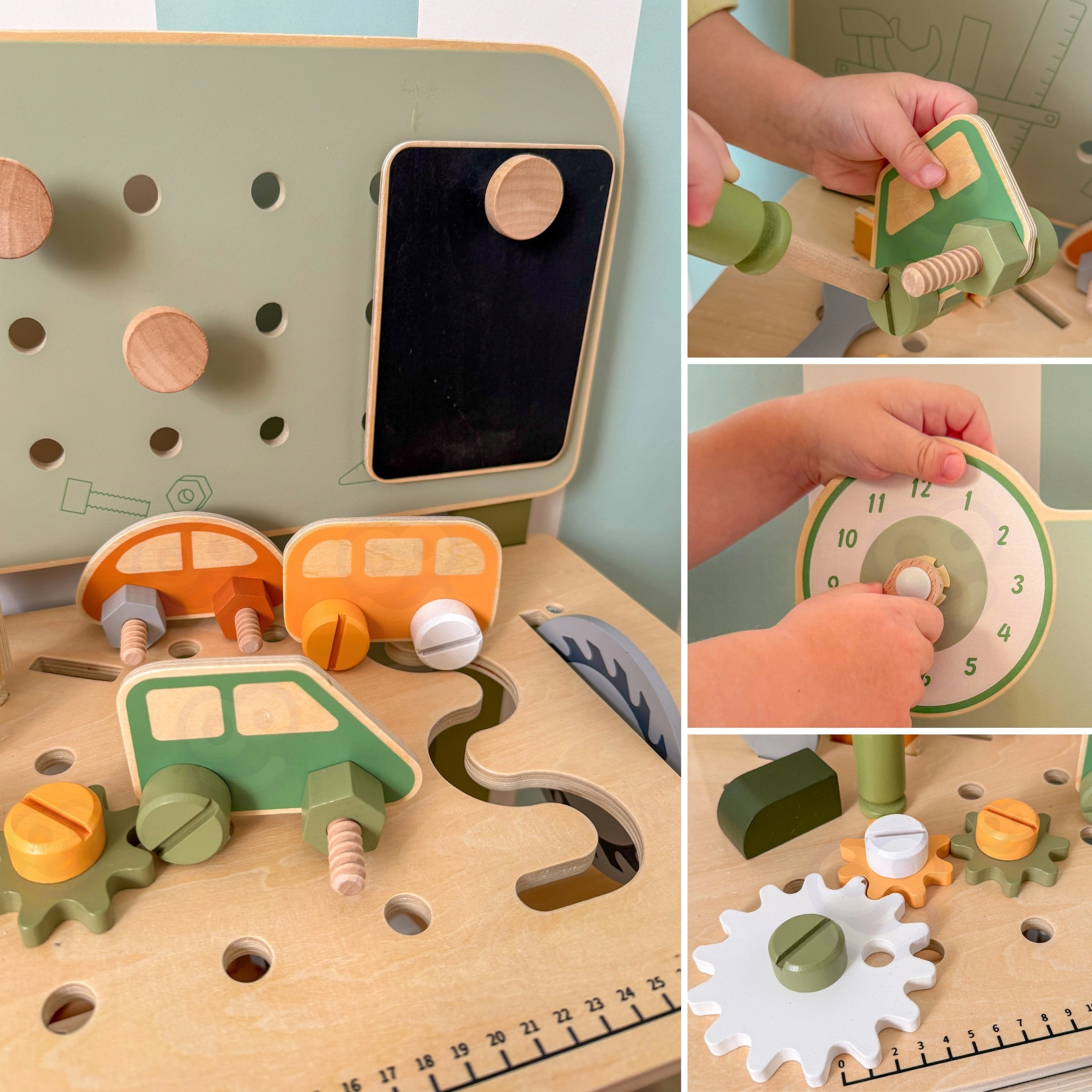 Στυλάτος παιδικός πάγκος σε φυσικό–πράσινο συνδυασμό που προσφέρει ρεαλιστική εμπειρία εργαστηρίου σε ασφαλή, ξύλινη μορφή. Τα παιδιά μπορούν να βιδώνουν, να αλλάζουν ροδάκια στο αυτοκινητάκι, να «κόβουν» κομμάτια, να συνθέτουν οδοντωτούς τροχούς και να ανακαλύπτουν τις αρχές αιτίας και αποτελέσματος. Χάρη στον οργανωμένο χώρο αποθήκευσης, όλα τα μέρη και τα εργαλεία μένουν πάντα στη θέση τους.