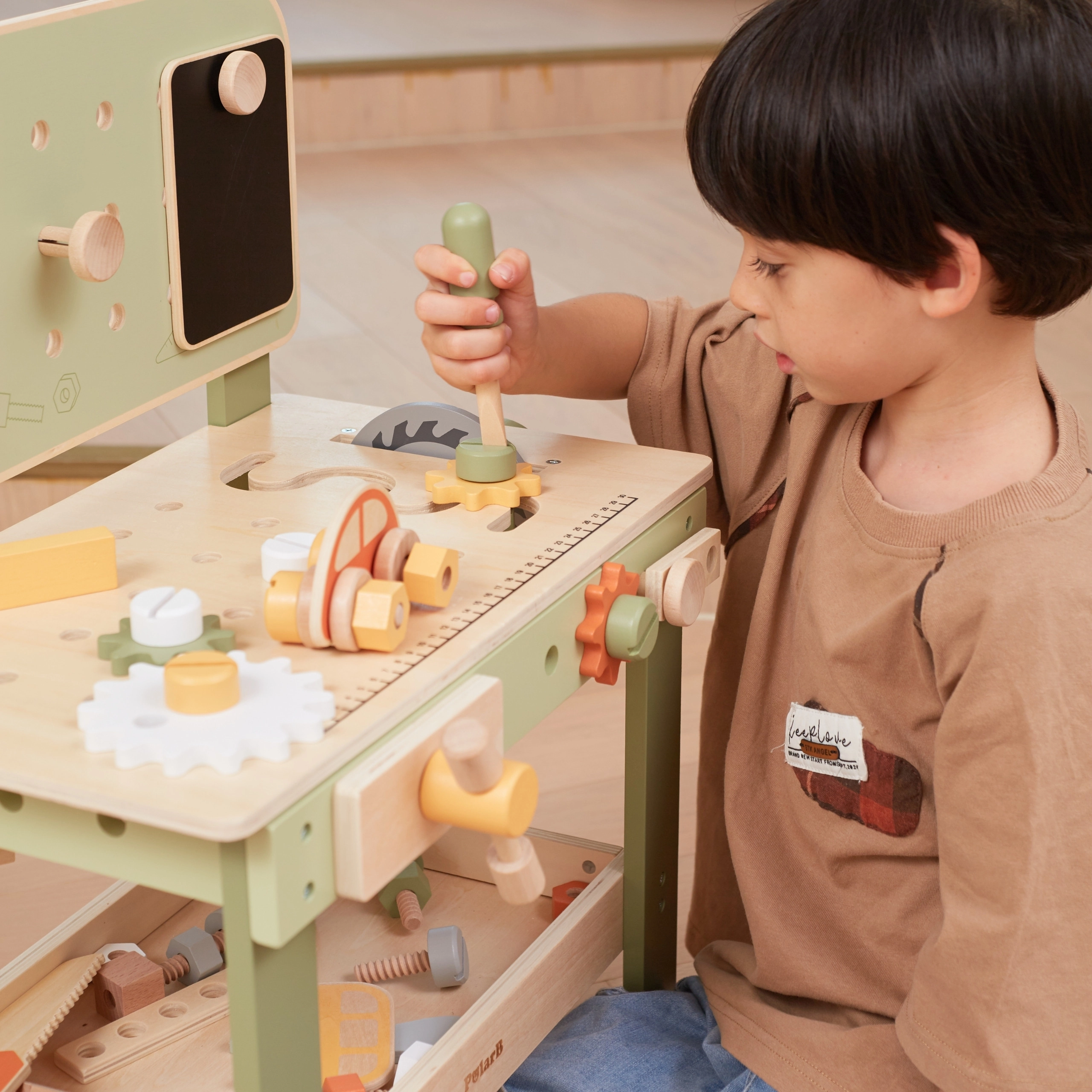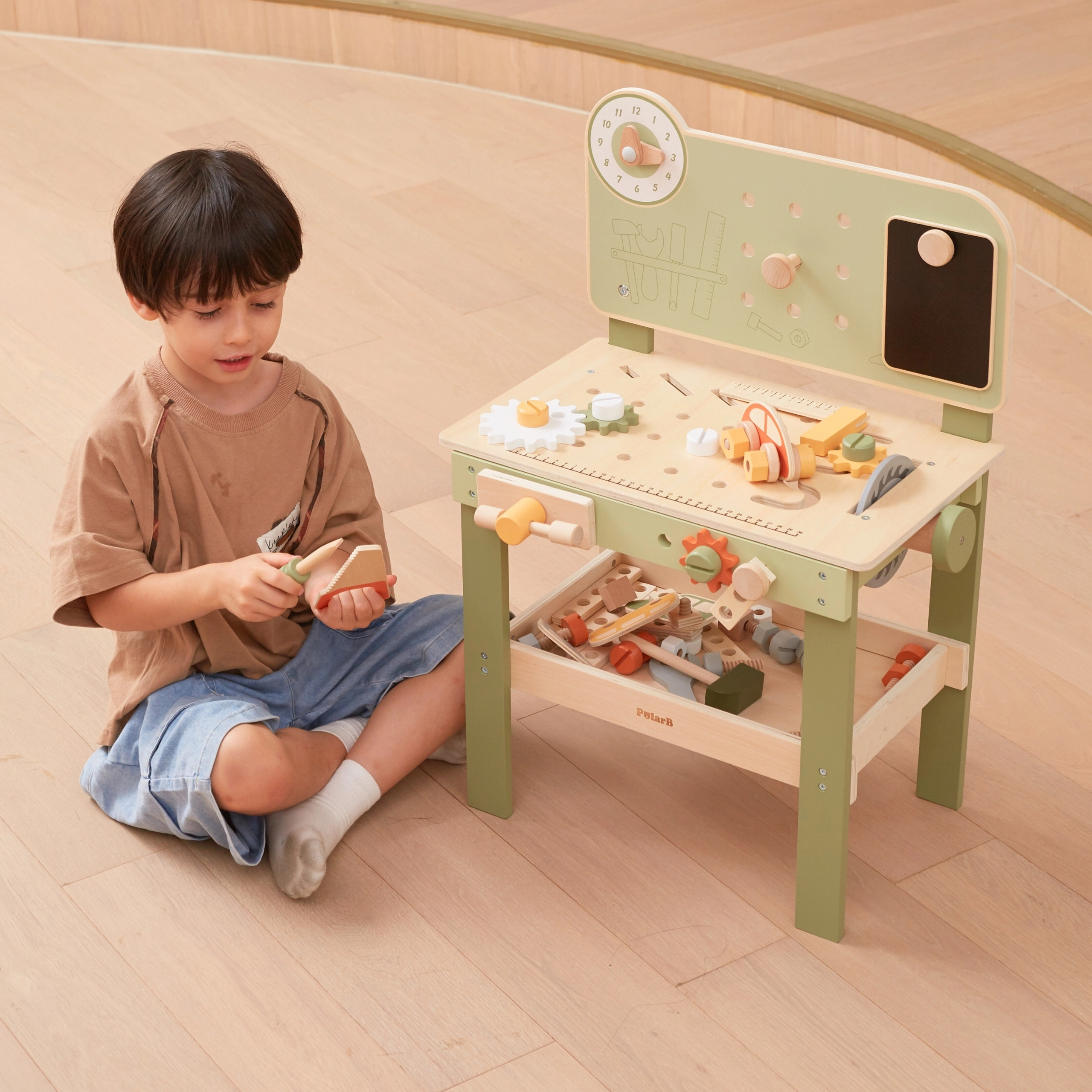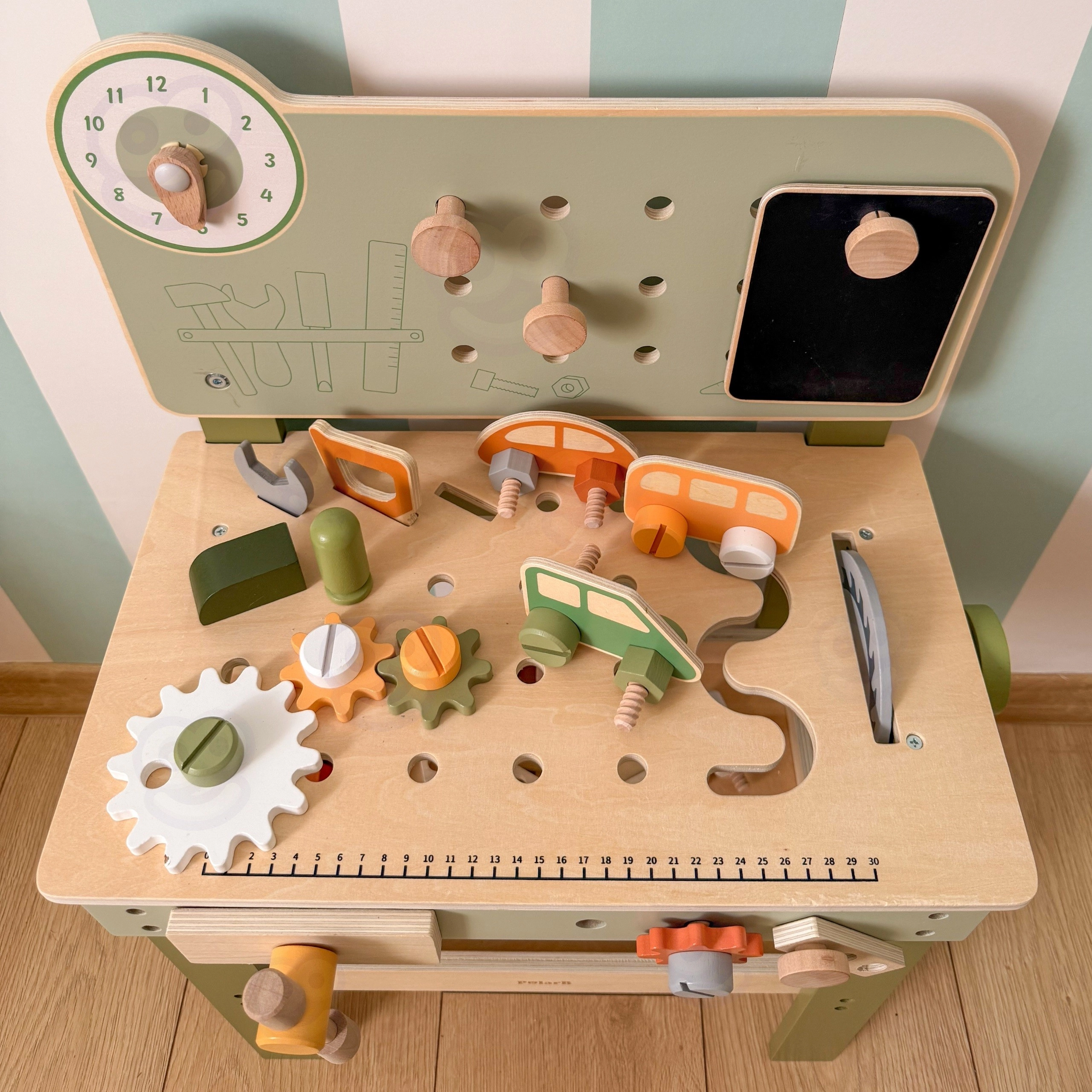 Στυλάτος παιδικός πάγκος σε φυσικό–πράσινο συνδυασμό που προσφέρει ρεαλιστική εμπειρία εργαστηρίου σε ασφαλή, ξύλινη μορφή. Τα παιδιά μπορούν να βιδώνουν, να αλλάζουν ροδάκια στο αυτοκινητάκι, να «κόβουν» κομμάτια, να συνθέτουν οδοντωτούς τροχούς και να ανακαλύπτουν τις αρχές αιτίας και αποτελέσματος. Χάρη στον οργανωμένο χώρο αποθήκευσης, όλα τα μέρη και τα εργαλεία μένουν πάντα στη θέση τους.