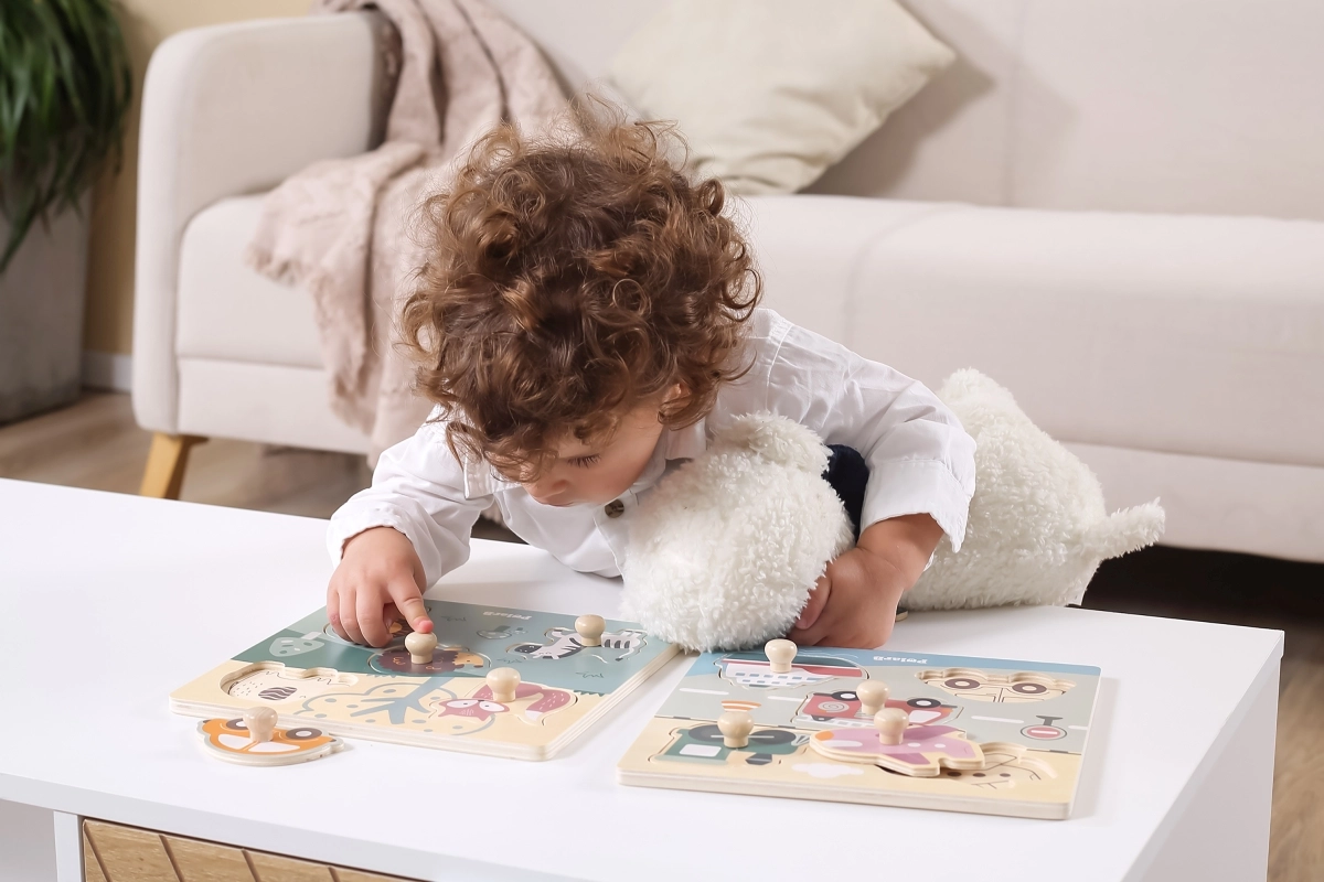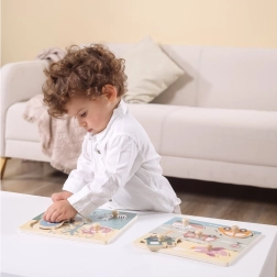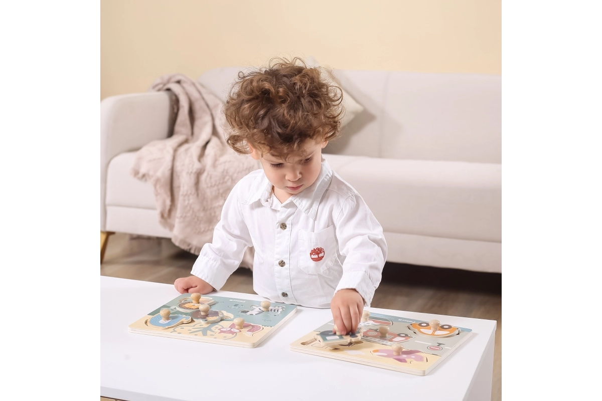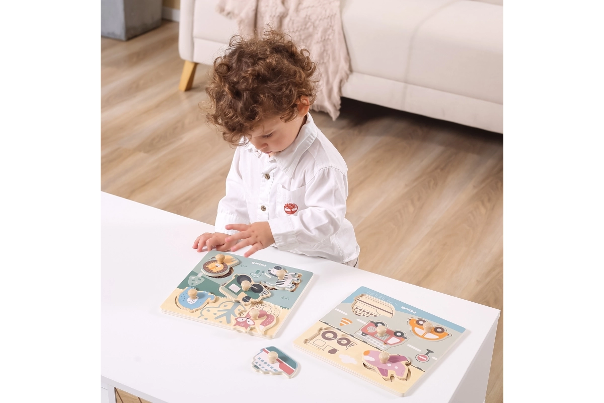 Το παιχνίδι είναι κατασκευασμένο από ανθεκτικό ξύλο και βαμμένο με μη τοξικές βαφές. Δεν έχει αιχμηρές άκρες και είναι ιδανικό για την πρώτη επαφή με παζλ. Με το στήσιμο, τα παιδιά αναπτύσσουν το λογικό τους σκέψη, γνωστικές δεξιότητες και αποκτούν αυτοπεποίθηση στη λεπτή κινητικότητα.