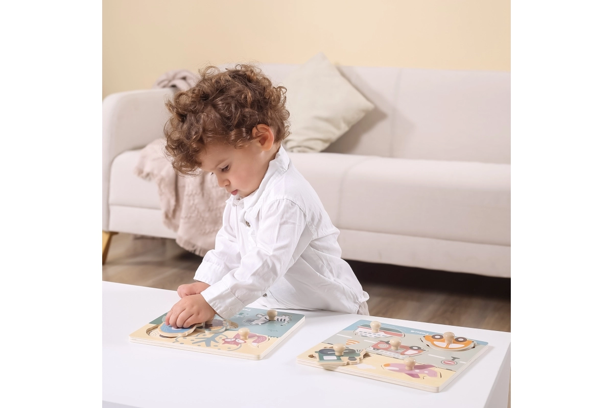 Οι εικονογραφήσεις στη βάση υποδεικνύουν τη σωστή τοποθέτηση των κομματιών. Τα παιδιά εξασκούν φυσικά την αναγνώριση σχημάτων, χρωμάτων και ζώων.