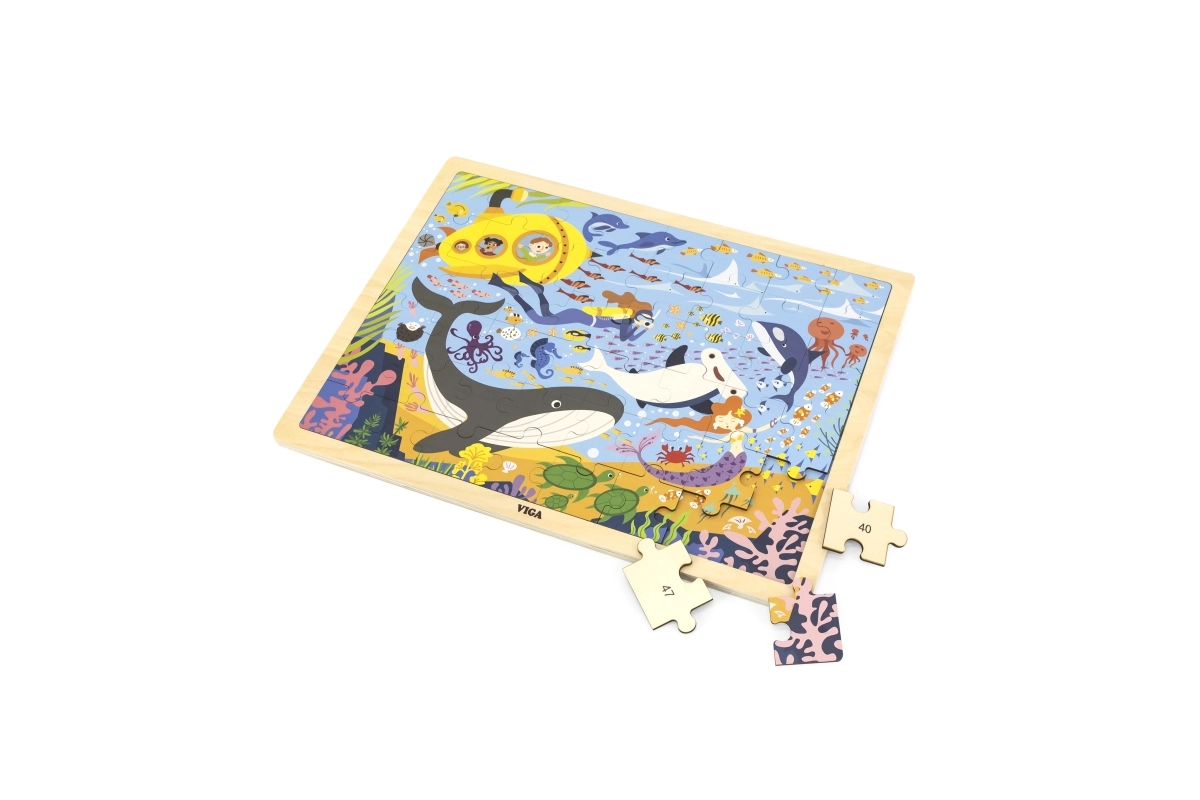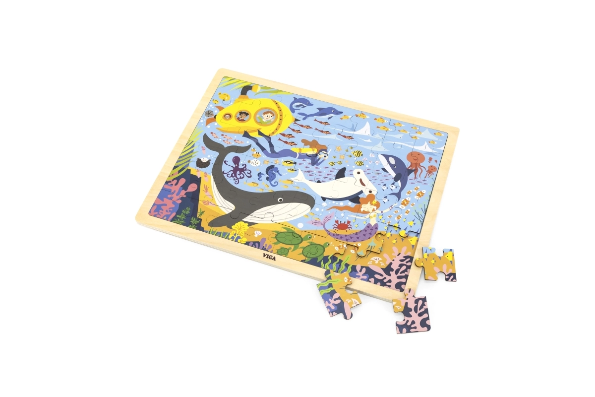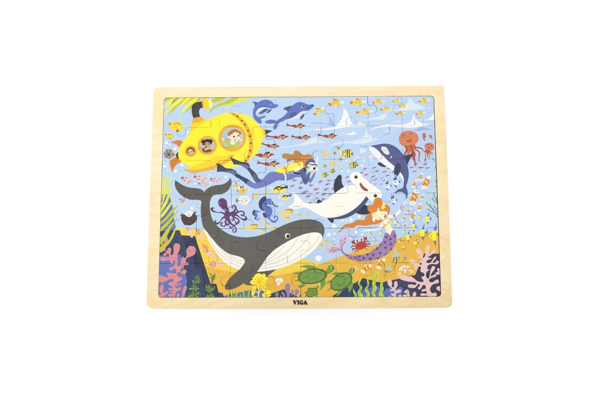 Με το ξύλινο παζλ Θαλάσσια Ζωή θα ανακαλύψετε μια υπέροχη ποικιλία θαλάσσιων ζώων, όπως φάλαινες και ψαράκια, όλα μαζί με ένα κίτρινο υποβρύχιο.