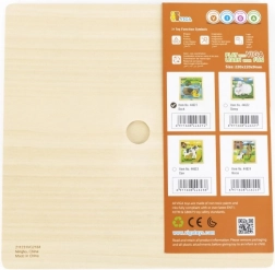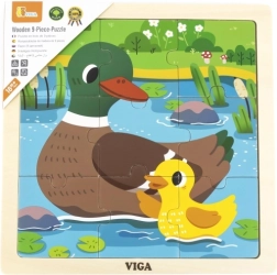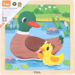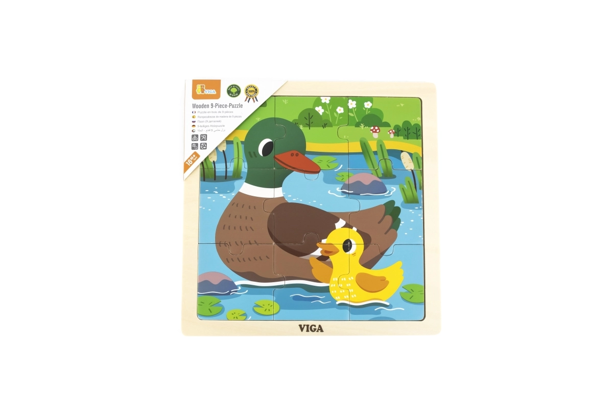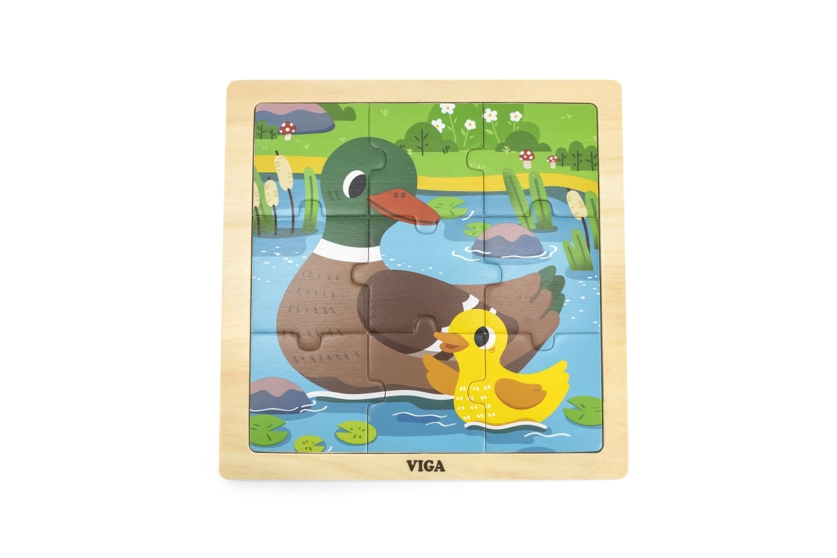 Παιδικό ξύλινο παζλ με θέμα πάπια και παπάκι που προσφέρει διασκεδαστική μάθηση μέσω του παιχνιδιού. Εννέα ανθεκτικά κομμάτια τοποθετούνται σε ξύλινο πλαίσιο και δημιουργούν μια χαρούμενη εικόνα λιμνούλας. Ζωηρά χρώματα, ανθεκτικό υλικό και μελετημένο σχήμα κομματιών διευκολύνουν τον χειρισμό και τα πρώτα επιτυχημένα βήματα στη συναρμολόγηση.
