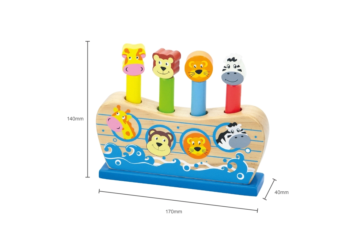 Πατήστε το κεφαλάκι και δείτε την καμηλοπάρδαλη, τη μαϊμού, το λιοντάρι και τη ζέβρα να πετάγονται χαρούμενα από το καράβι. Ιδανικό παιχνίδι για κατανόηση της αρχής δράσης–αντίδρασης.