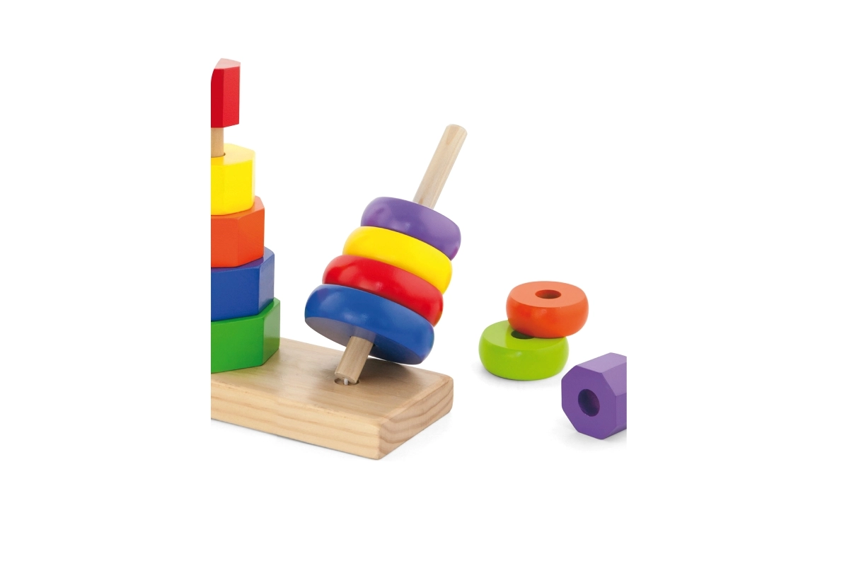 - Διαδραστικής συναρμολόγησης: Τα πολύχρωμα κομμάτια μπορούν να συνδυαστούν και να στοιβαχτούν σε τρεις διαφορετικούς πασσάλους.