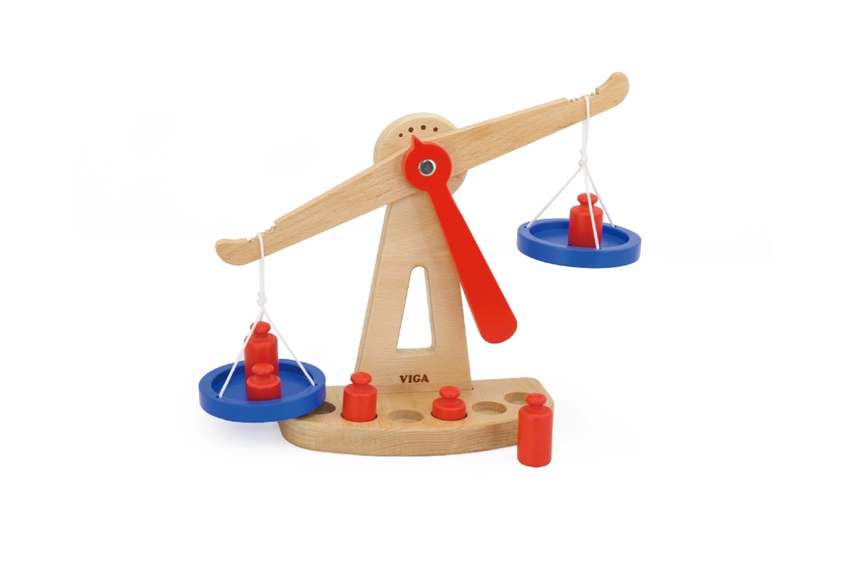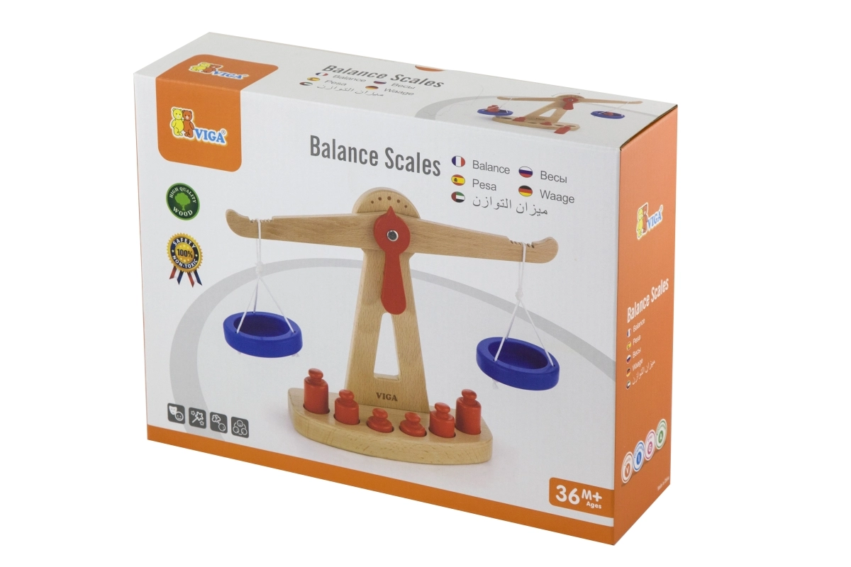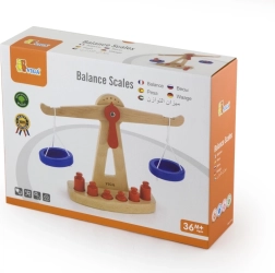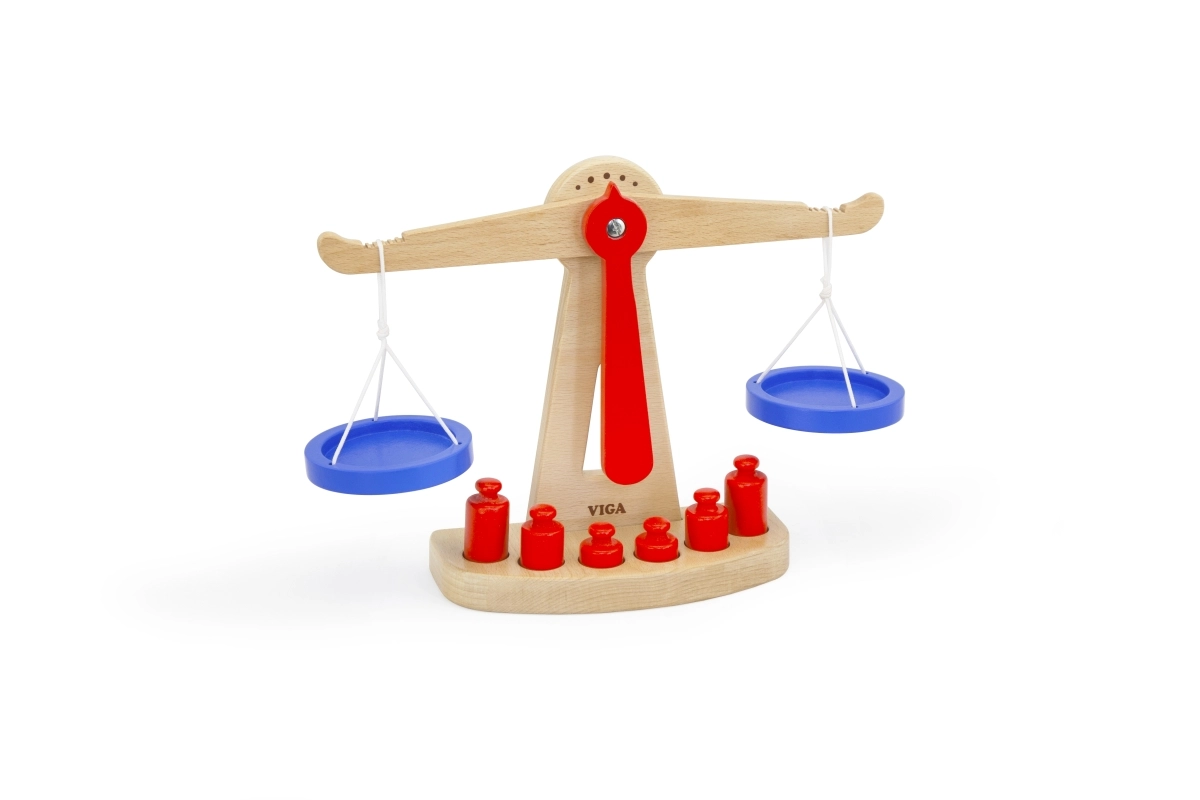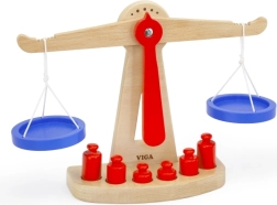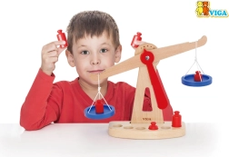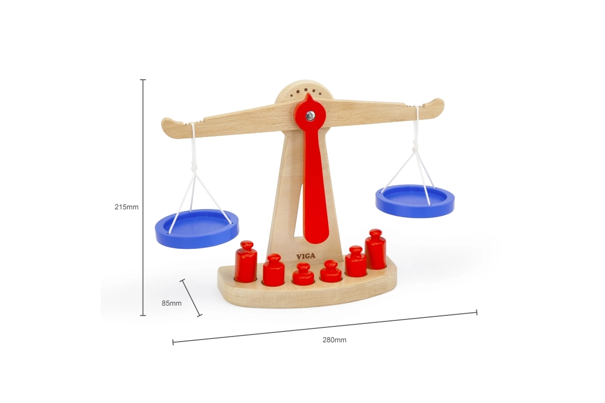 Η ξύλινη ζυγαριά ισορροπίας της Viga είναι εξοπλισμένη με δύο μπλε δίσκους κρεμασμένους σε κορδόνια και περιλαμβάνει έξι κόκκινα βαρίδια διαφορετικών μεγεθών. Χάρη στον χρωματιστό σχεδιασμό και τη ασφαλή επιφάνεια, αυτή η ζυγαριά προσφέρει στα παιδιά πολλή διασκέδαση. Έχει σχεδιαστεί ώστε να ενθαρρύνει τα παιδιά να χρησιμοποιούν τη φαντασία τους στο παιχνίδι ρόλων (π.χ. κατάστημα), βοηθώντας τα να κατανοήσουν βασικές μαθηματικές έννοιες και τη σημασία της ισορροπίας.