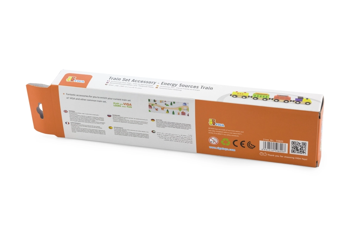 Το τρενάκι VIGA με θέμα τις πηγές ενέργειας προσφέρει πολλή διασκέδαση και μάθηση. Το σετ περιλαμβάνει μηχανή και τρία διαφορετικά βαγόνια (π.χ. βυτιοφόρο, φορτηγό και βαγόνι άνθρακα), τα οποία τα παιδιά συνδέουν εύκολα με μαγνήτες. Η ποιοτική ξύλινη κατασκευή και ο πολύχρωμος σχεδιασμός προσκαλούν στο παιχνίδι και αναπτύσσουν τη φαντασία.