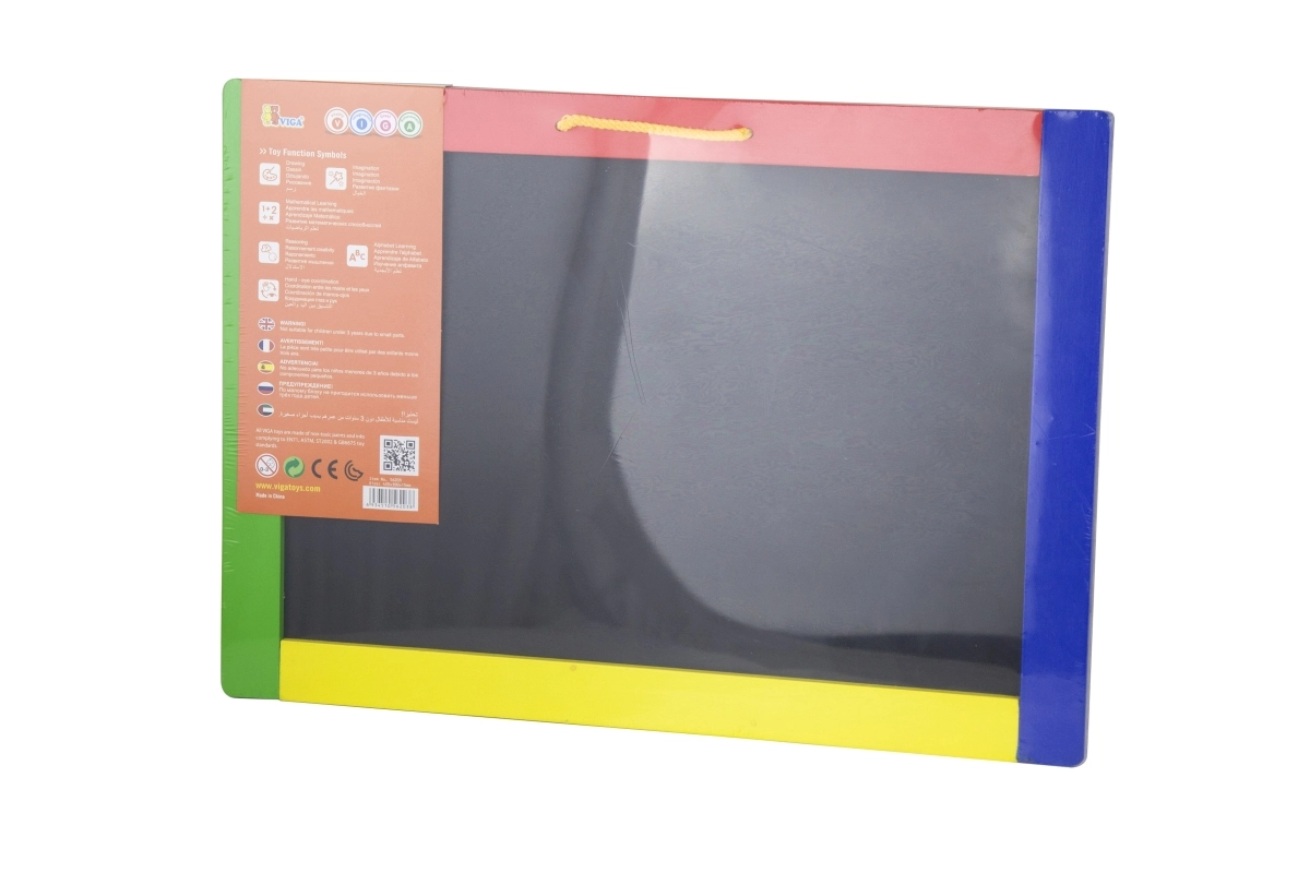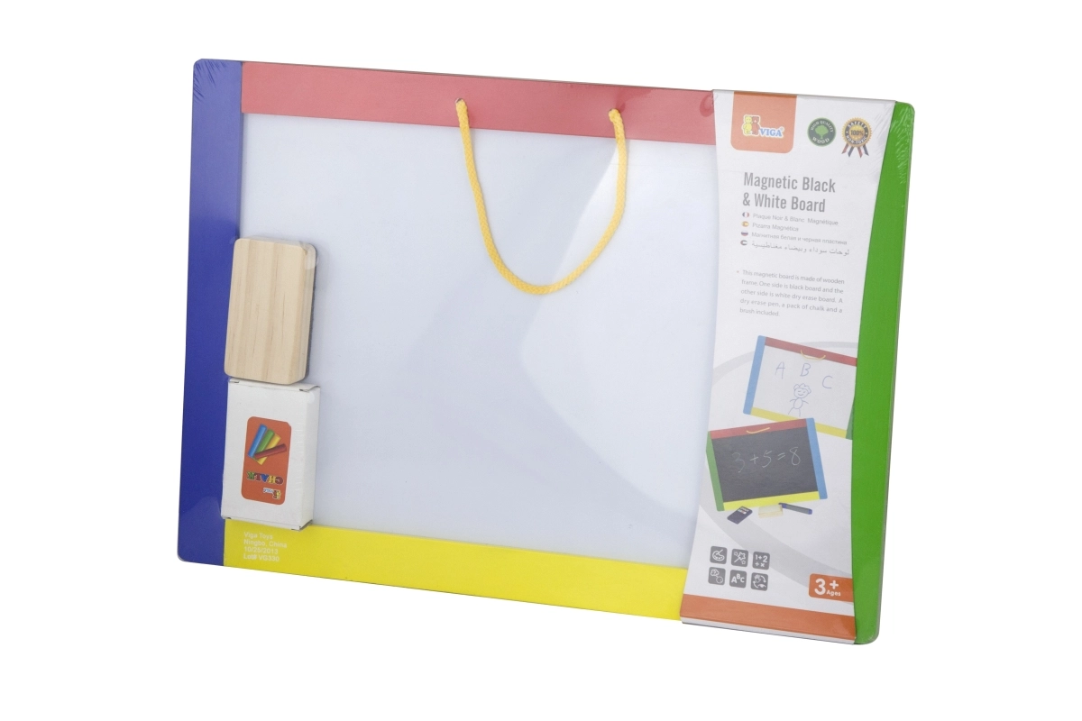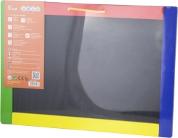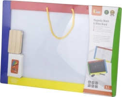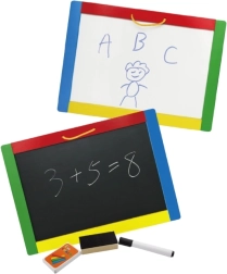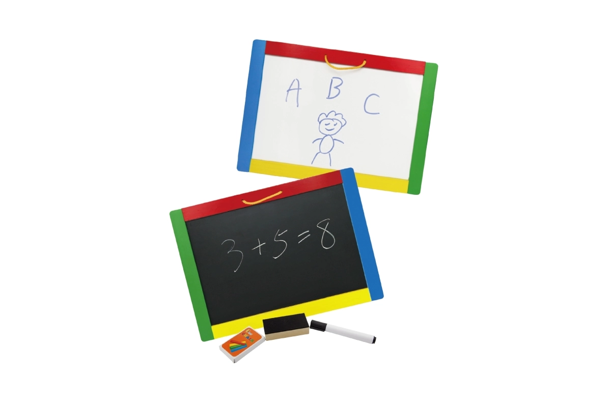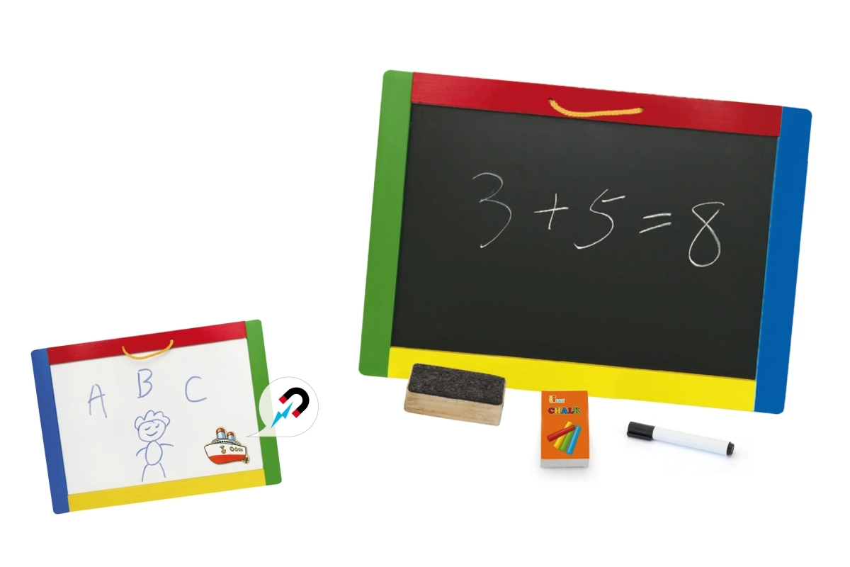 Αυτός ο πολυχρηστικός πίνακας συνδυάζει δύο δημιουργικές επιφάνειες σε μία – μαύρη μαγνητική πλευρά για κιμωλίες και λευκή σβηστή πλευρά για μαρκαδόρο. Τα παιδιά μπορούν να γράφουν, να σχεδιάζουν και να εξασκούν γράμματα και αριθμούς· στη μαύρη πλευρά μπορούν επιπλέον να στερεώνουν μαγνητάκια. Στη συσκευασία θα βρείτε ό,τι χρειάζεται για άμεση χρήση: 4 κιμωλίες, σβηστό μαρκαδόρο και σφουγγαράκι.