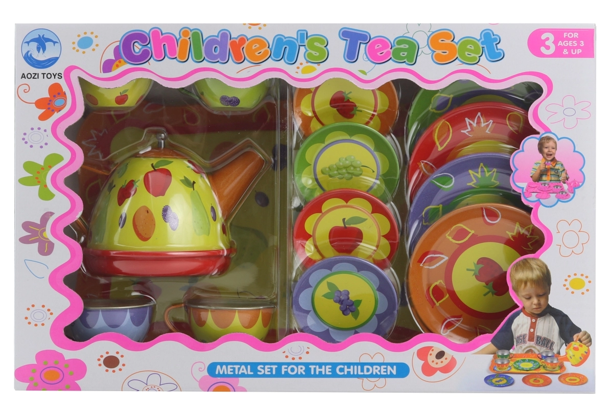 Το στιλάτο μεταλλικό σετ τσαγιού θα χαροποιήσει κάθε μικρή οικοδέσποινα και οικοδεσπότη. Περιλαμβάνει όλα όσα χρειάζονται για παιχνίδι τσαγιού – τσαγερό, φλιτζανάκια με πιατάκια, πιατάκια σερβιρίσματος και δίσκο σερβιρίσματος. Η ανθεκτική μεταλλική κατασκευή είναι ελαφριά, ασφαλής και ιδανική για παιδιά από 3 ετών.