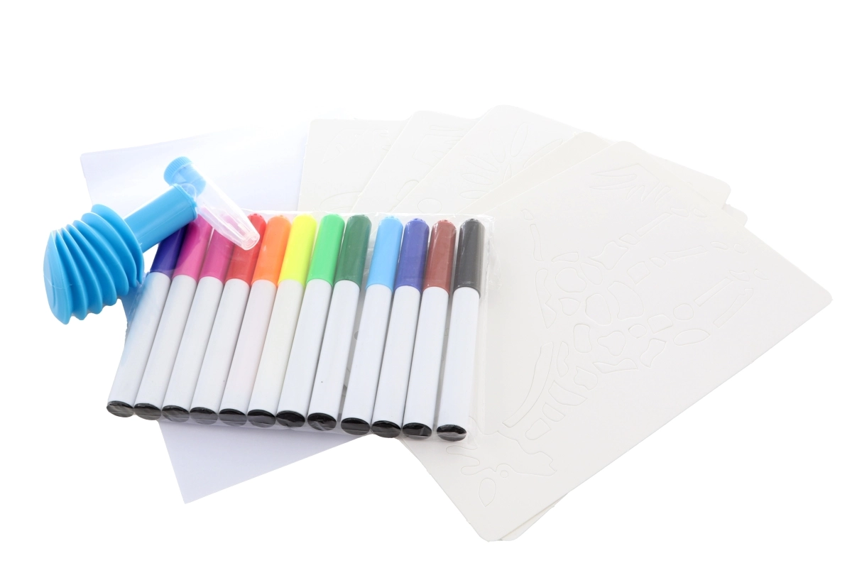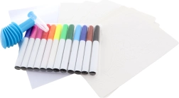 - 12 πολύχρωμοι μαρκαδόροι, 8 στένσιλ, 6 χαρτιά, χάρτινο σταντ με βάση, επιστόμιο για φύσημα με αντλία