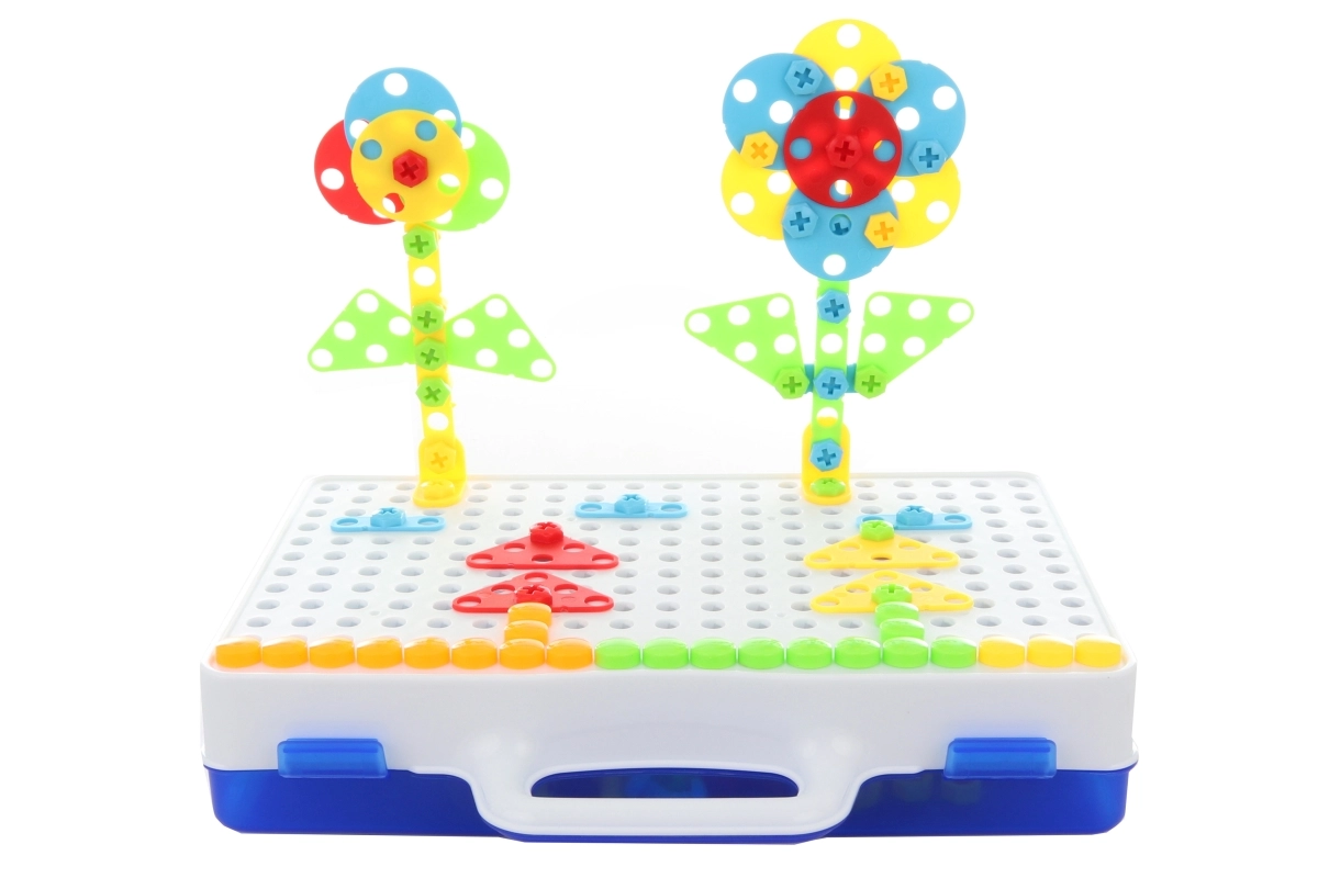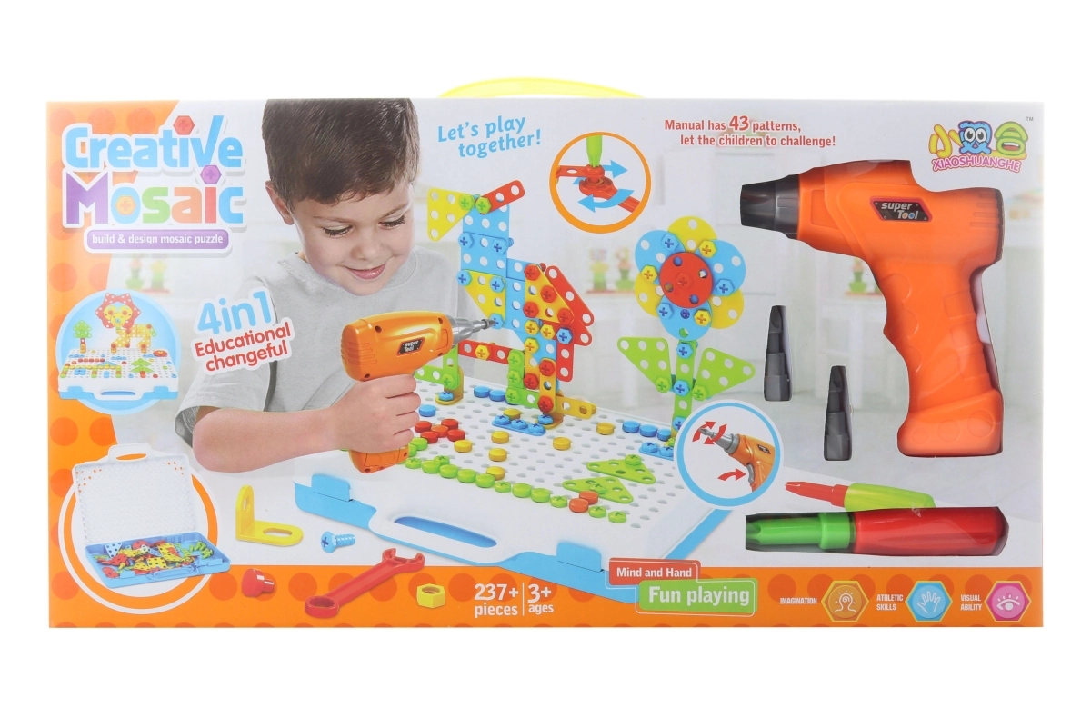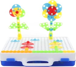 Δημιουργικό σετ κατασκευών με βίδες και δράπανο προσφέρει σε παιδιά από 3 ετών ώρες διασκέδασης και μάθησης. Στην πρακτική βαλίτσα θα βρείτε 237 κομμάτια, παιδικό δράπανο, κατσαβίδι και οδηγίες. Τα παιδιά αναπτύσσουν λεπτή κινητικότητα, δημιουργικότητα και λογική σκέψη κατασκευάζοντας πολύχρωμα μοτίβα και 3D δημιουργίες σε μια διάτρητη βάση.