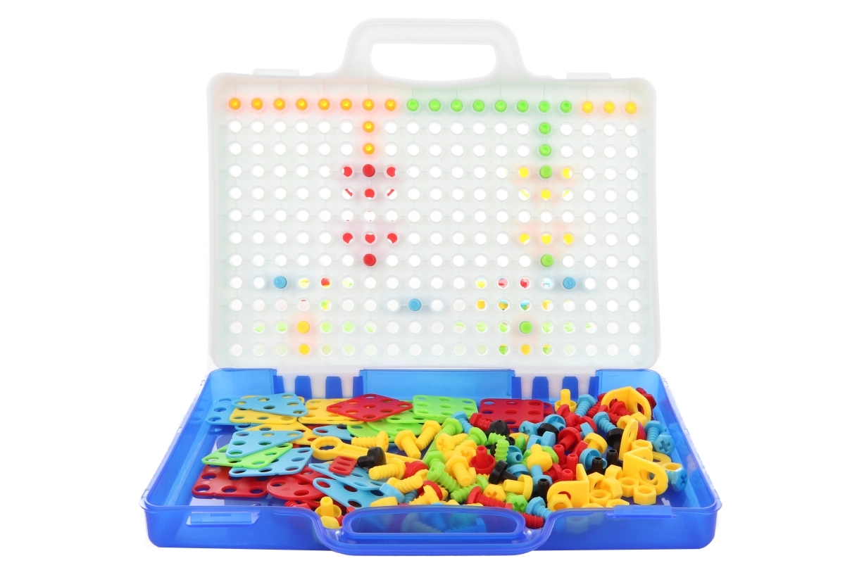 Όλα τοποθετούνται στη φορητή βαλίτσα με καπάκι που λειτουργεί ως pegboard, ώστε το σετ να μεταφέρεται και να τακτοποιείται εύκολα. Εξαιρετικό βοήθημα για την ανάπτυξη της κινητικότητας, του συντονισμού χεριού–ματιού, της δημιουργικότητας και της υπομονής.