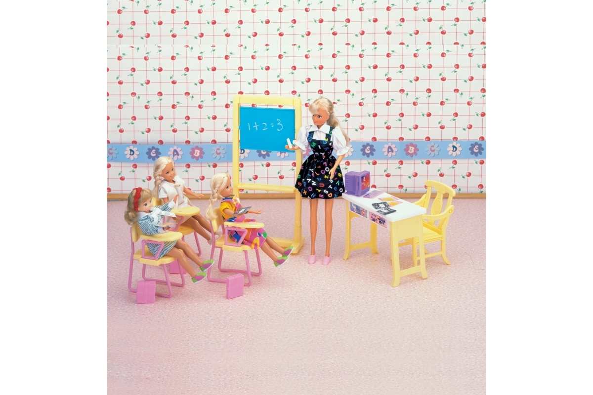 Στη συσκευασία περιλαμβάνονται ευρύχωρος πίνακας, γωνιά δασκάλου με υπολογιστή και καρέκλες για τους μαθητές. Χάρη στις συμπαγείς διαστάσεις, το σετ είναι συμβατό με συνηθισμένες κούκλες και αποθηκεύεται εύκολα.