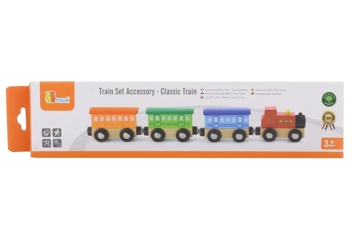 Το ξύλινο σετ Κλασικό τρενάκι περιλαμβάνει 4 μέρη που συνδέονται με μαγνήτες. Αυτό το παιχνίδι έχει σχεδιαστεί από τον καταξιωμένο κατασκευαστή ξύλινων παιχνιδιών, τη Viga Toys. Το σετ μπορεί να χρησιμοποιηθεί ως αυτόνομο παιχνίδι ή ως συμπλήρωμα σε άλλες σιδηροδρομικές πίστες, κατασκευές και σετ.