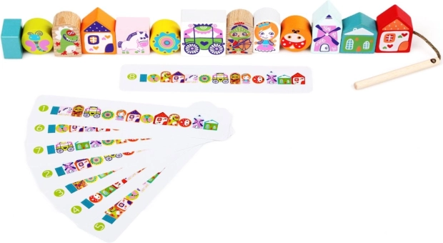 Περιλαμβάνει 13 ξύλινα κομμάτια με παραμυθένια μοτίβα για διασκεδαστικό πέρασμα σε κορδόνι.