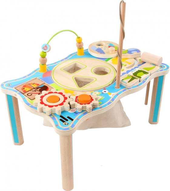 • Πολλαπλές δραστηριότητες σε ένα: οδοντωτοί τροχοί, χάντρες, κοπανητήρι, ταξινόμηση σχημάτων, μαγνητικό ψάρεμα