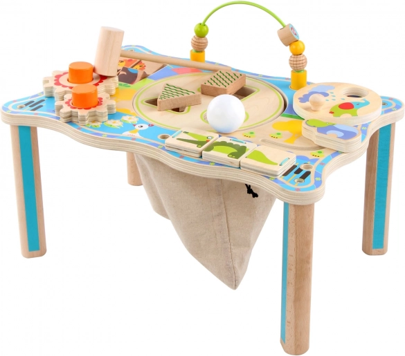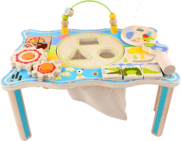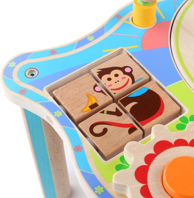 Το ξύλινο τραπεζάκι με μοτίβα ζούγκλας συνδυάζει διασκέδαση και μάθηση και υποστηρίζει τη λεπτή κινητικότητα, τον συντονισμό ματιού–χεριού και τη λογική σκέψη. Τα παιδιά μπορούν να περιστρέφουν τους οδοντωτούς τροχούς, να μετακινούν χάντρες στην τροχιά, να εξασκούν δύναμη και συγκέντρωση με το κοπανητήρι και να καλλιεργούν την αναγνώριση σχημάτων χάρη στην ταξινόμηση σχημάτων. Στο κέντρο υπάρχει λινό πουγκί για τα ψαράκια και τα κομμάτια του παιχνιδιού, ώστε η επιφάνεια να παραμένει τακτοποιημένη.