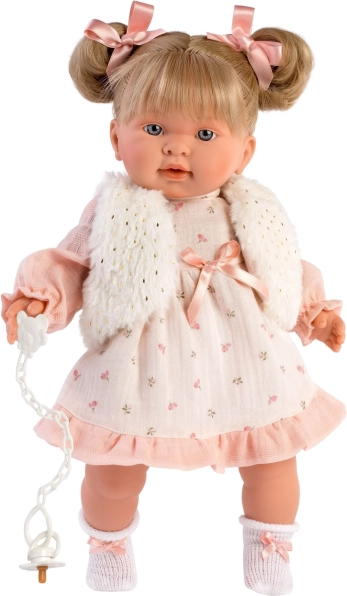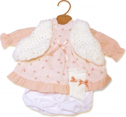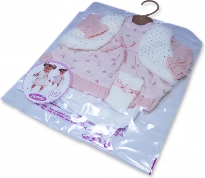 Προσφέρετε στην κούκλα σας μια νέα γκαρνταρόμπα: ροζ φορεματάκι με διακριτικό μοτίβο, συμπληρωμένο από ένα απαλό λευκό γιλεκάκι και άνετο σλιπάκι. Το σετ έχει σχεδιαστεί για κούκλες μεγέθους 42 cm και ξεχωρίζει για τις ταιριαστές λεπτομέρειες και το εύκολο ντύσιμο.