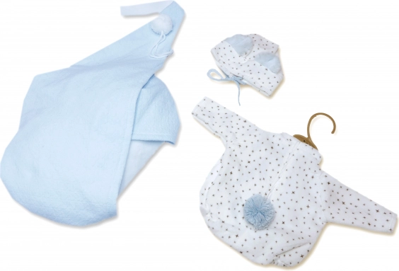 Χαρίστε στην κούκλα NEW BORN στυλ και άνεση. Αυτό το προσεκτικά ταιριασμένο σετ περιλαμβάνει απαλό ρουχαλάκι σε μπλε–λευκό σχέδιο με μοτίβο αστεριών και μια πρακτική αιώμενη κρεμαστή θήκη που δημιουργεί ένα ζεστό μικρό χώρο για την κούκλα. Ιδανικό για παιχνίδι φροντίδας και για να βάζετε την κούκλα για ύπνο.