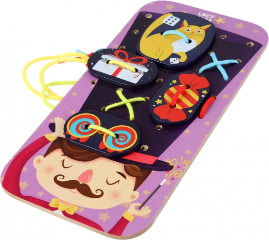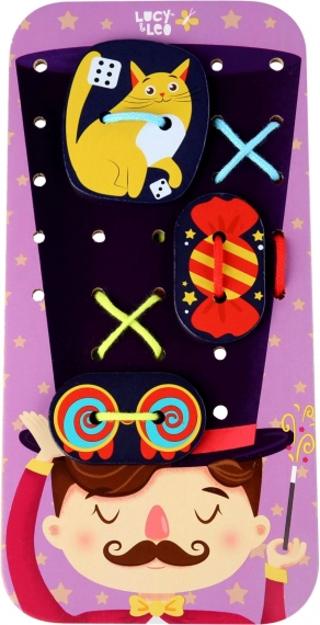 Αυτό το διασκεδαστικό σετ περασμάτων και δεσίματος με θέμα τον μάγο καλεί τα παιδιά σε έναν κόσμο φαντασίας. Στη μεγάλη βάση με το κεφάλι του μάγου και το καπέλο του μπορούν, με τη βοήθεια των κορδονιών, να στερεώνουν πολύχρωμα αξεσουάρ – από κουνελάκι και νομίσματα μέχρι μυστηριώδεις κάρτες. Κατά το παιχνίδι τα παιδιά εξασκούν τον συντονισμό ματιού–χεριού, την υπομονή και τη δημιουργικότητα.