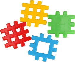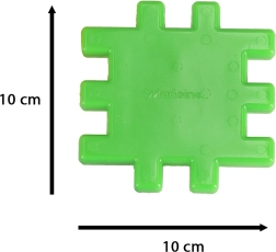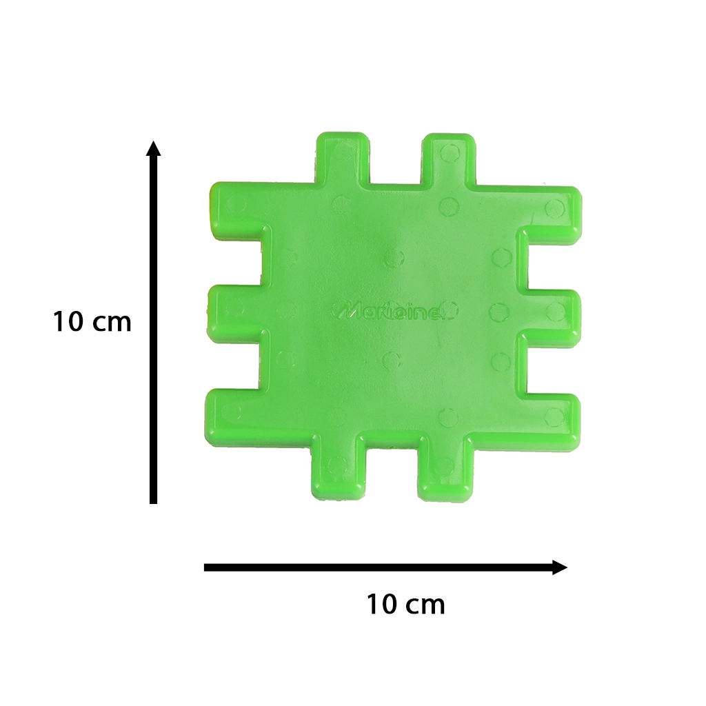 Κομμάτια διαστάσεων περίπου 10,5 × 10,5 cm με πλέγμα-κλείδωμα που κρατιούνται άνετα και συνδέονται με ασφάλεια – τέλειο για μικρά χέρια από 2 ετών.