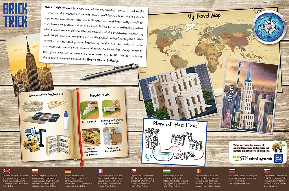 Ανακαλύψτε τον κόσμο της δόμησης με τη σειρά BRICK TRICK Travel και δημιουργήστε το δικό σας μοντέλο ενός από τα διασημότερα κτίρια στον κόσμο – το EMPIRE STATE BUILDING. Τουβλάκι-τουβλάκι, με κοπή και κόλληση των σανιδών, θα φτάσετε βήμα-βήμα σε μια λεπτομερή και σταθερή κατασκευή. Στο τέλος, ολοκληρώστε την με τα συμπεριλαμβανόμενα διακοσμητικά για αυθεντική όψη.
