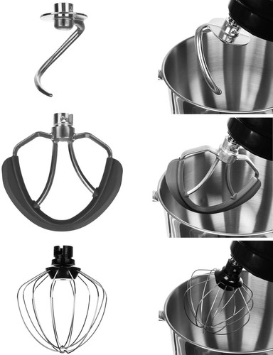 Στη συσκευασία περιλαμβάνονται τρία διαφορετικά εξαρτήματα: σύρμα, γάντζος ζύμης και αναδευτήρας. Απαραίτητα εργαλεία για τέλεια προετοιμασία ζυμών, κρεμών και όλων των αγαπημένων σας λιχουδιών. Επιπλέον, περιλαμβάνονται κομψά αξεσουάρ όπως σακούλα ζαχαροπλαστικής, μύτες και διαχωριστής αυγών.