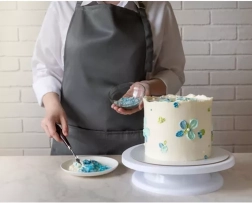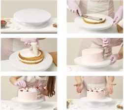 Εξοπλισμένη με αποσπώμενη βάση για εύκολο χειρισμό, ο περιστρεφόμενος μηχανισμός επιτρέπει ομαλή περιστροφή και προς τις δύο κατευθύνσεις, διευκολύνοντας την εφαρμογή γλάσου και άλλων διακοσμήσεων. Οι συνοδευτικές τρεις σπάτουλες διακόσμησης έχουν διαφορετικά μοτίβα, επιτρέποντάς σας να δημιουργείτε μοναδικές και δημιουργικές επιφάνειες στις τούρτες σας.