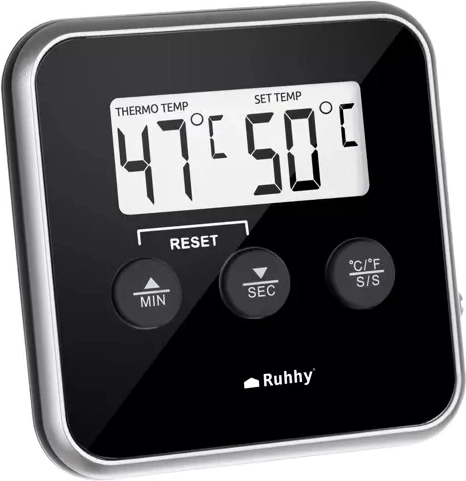Με την επίτευξη της ρυθμισμένης θερμοκρασίας ενεργοποιείται ηχητικός συναγερμός. Ο ενσωματωμένος χρονομετρητής και ο μαγνήτης στο πίσω μέρος διευκολύνουν το χρονισμό και τη στερέωση σε μεταλλικές επιφάνειες.