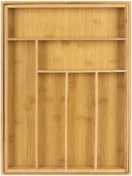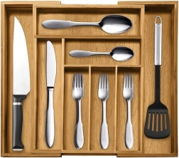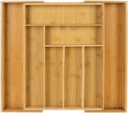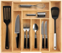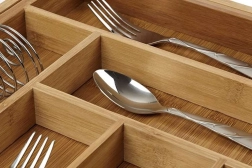 Ο οργανωτής έχει σχεδιαστεί ώστε να κρατά τα αντικείμενα τακτοποιημένα στη θέση τους και να διευκολύνει την καθημερινή χρήση. Η λεία κατασκευή από μπαμπού μειώνει την προσκόλληση ρύπων και επιτρέπει εύκολη συντήρηση κάτω από τρεχούμενο νερό. Το πρακτικό ύψος και ο χωρισμός των θηκών εξασφαλίζουν άνετη αποθήκευση κουταλιών, πιρουνιών, μαχαιριών και μικρών αξεσουάρ.