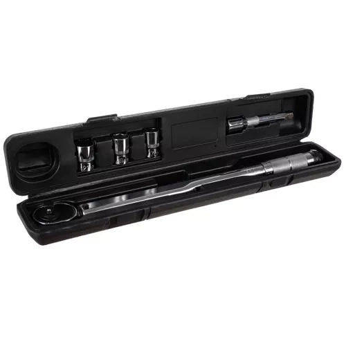 Ανθεκτικό δυναμόκλειδο 1/2" με καστάνια και σετ καρυδάκια 17/19/21 mm και προέκταση για ακριβές σφίξιμο και λύσιμο βιδωτών συνδέσεων. Προσφέρει εύρος ροπής 28–210 Nm, αμφίδρομη λειτουργία δεξιά/αριστερά, κλείδωμα LOCK/UNLOCK και πρακτική προστατευτική θήκη για ασφαλή αποθήκευση. Ιδανικό για εξάγωνες και τετράγωνες βίδες, γάντζους και παξιμάδια μοτοσικλέτας.