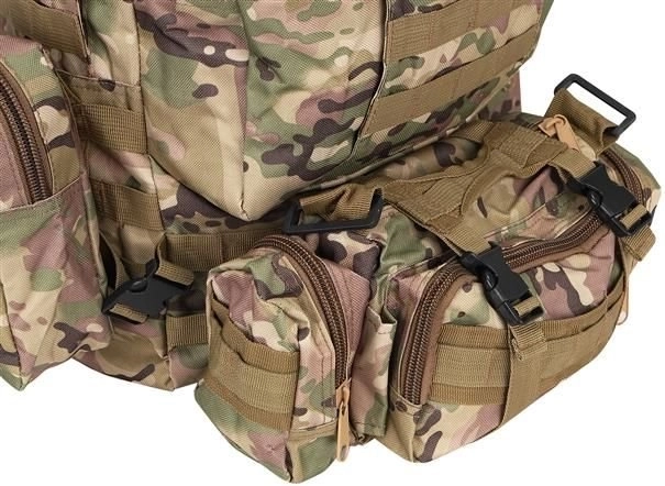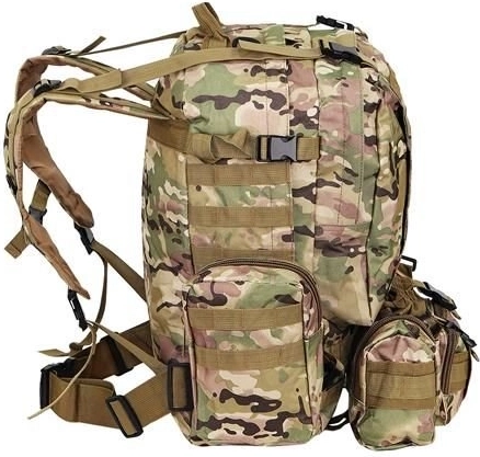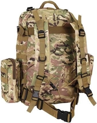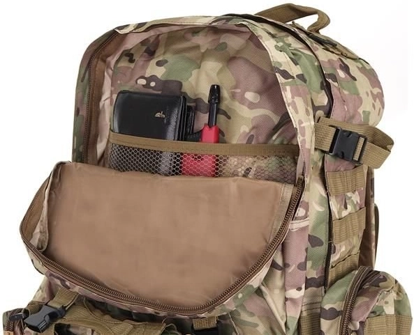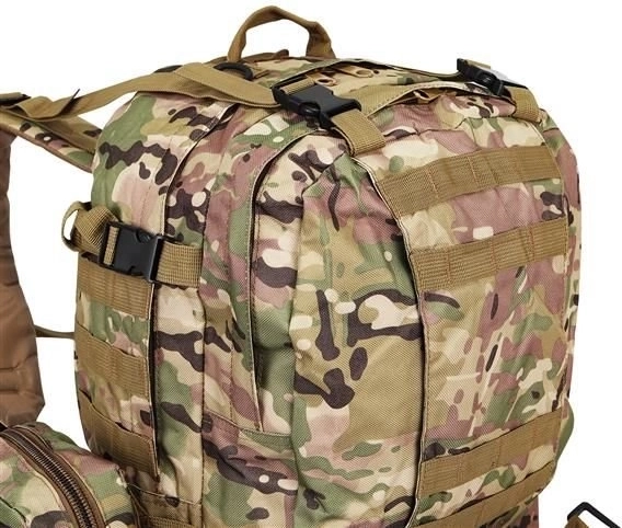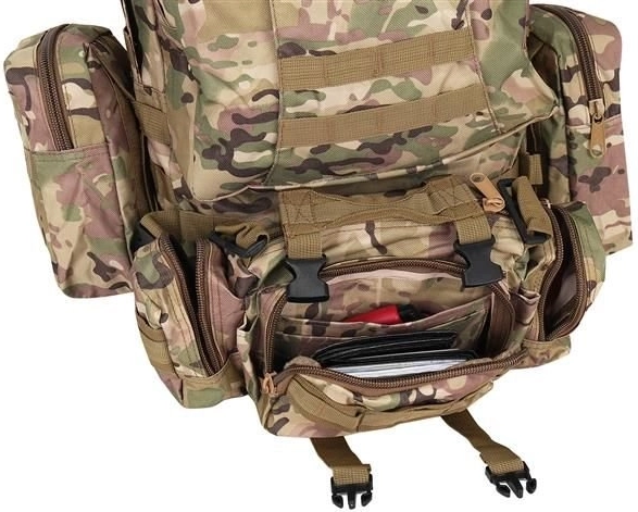 Το μεγάλο στρατιωτικό σακίδιο 45l προσφέρει 2 κύριες θήκες με πρόσθετες τσέπες και τρεις αποσπώμενες θήκες, που παρέχουν άφθονο χώρο για όλο τον εξοπλισμό σας. Είναι κατασκευασμένο από ύφασμα Oxford 900D, το οποίο εξασφαλίζει αντοχή στο σκίσιμο και τη φθορά. Η εσωτερική επένδυση PVC αυξάνει την αντοχή στο νερό, ενώ το διαπνέον πλέγμα στους ιμάντες και την πλάτη βελτιώνει τον αερισμό.